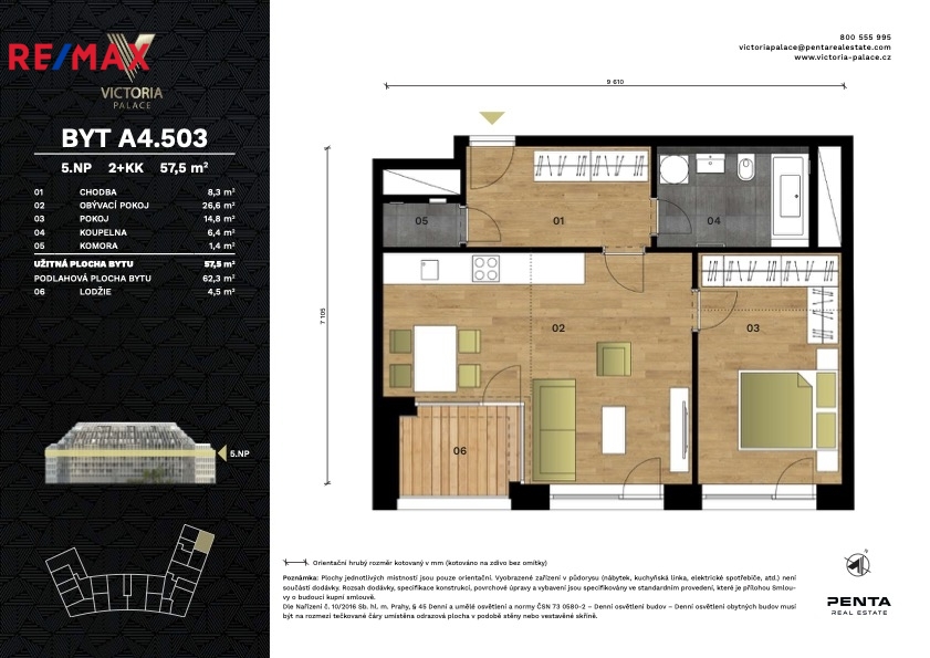 Nabízíme k pronájmu luxusní byt 2+kk o velikosti 62,3 m² s lodžií o výměře 4,5 m², sklepem a garážovým parkovacím stáním v rezidenčním projektu Victoria Palace, který se nachází přímo u Vítězného náměstí v pražských Dejvicích. Byt umístěný v 5. patře moderního domu s recepcí a kamerovým systémem nabízí unikátní výhled na Kulaťák.