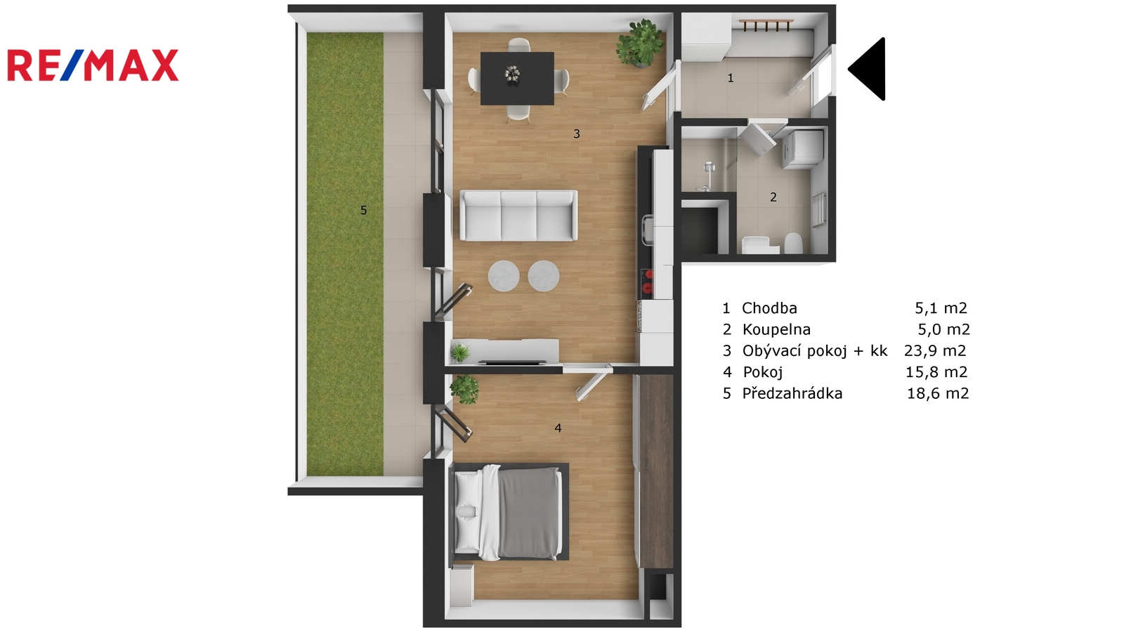 Byt nabízí obývací pokoj s plně vybaveným moderním kuchyňským koutem, ložnici s vestavěnou skříní , vstupní halu s vestavěnou skříní/šatnou, koupelnu se sprchovým koutem a WC, která je vybavena pračkou a sušičkou. Byt je kompletně zařízený nábytkem na míru. V - 1.PP je k dispozici sklep 6 m2. Podlahové topení.