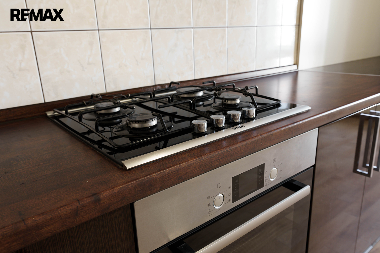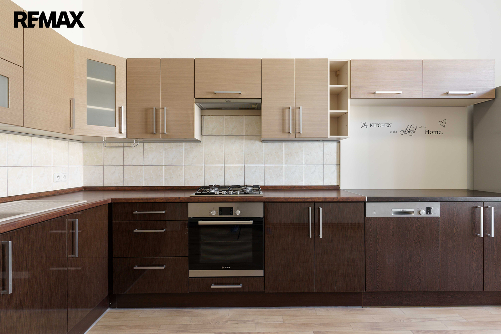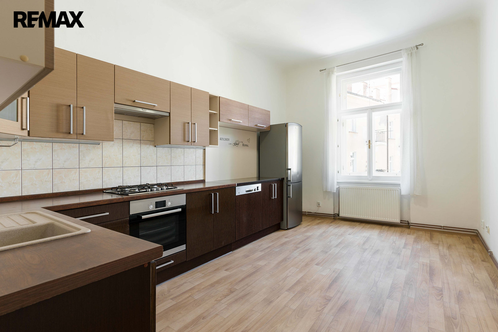 Kuchyňská linka je plně vybavena a součástí je plynový sporák, elektrická trouba, myčka a lednička.