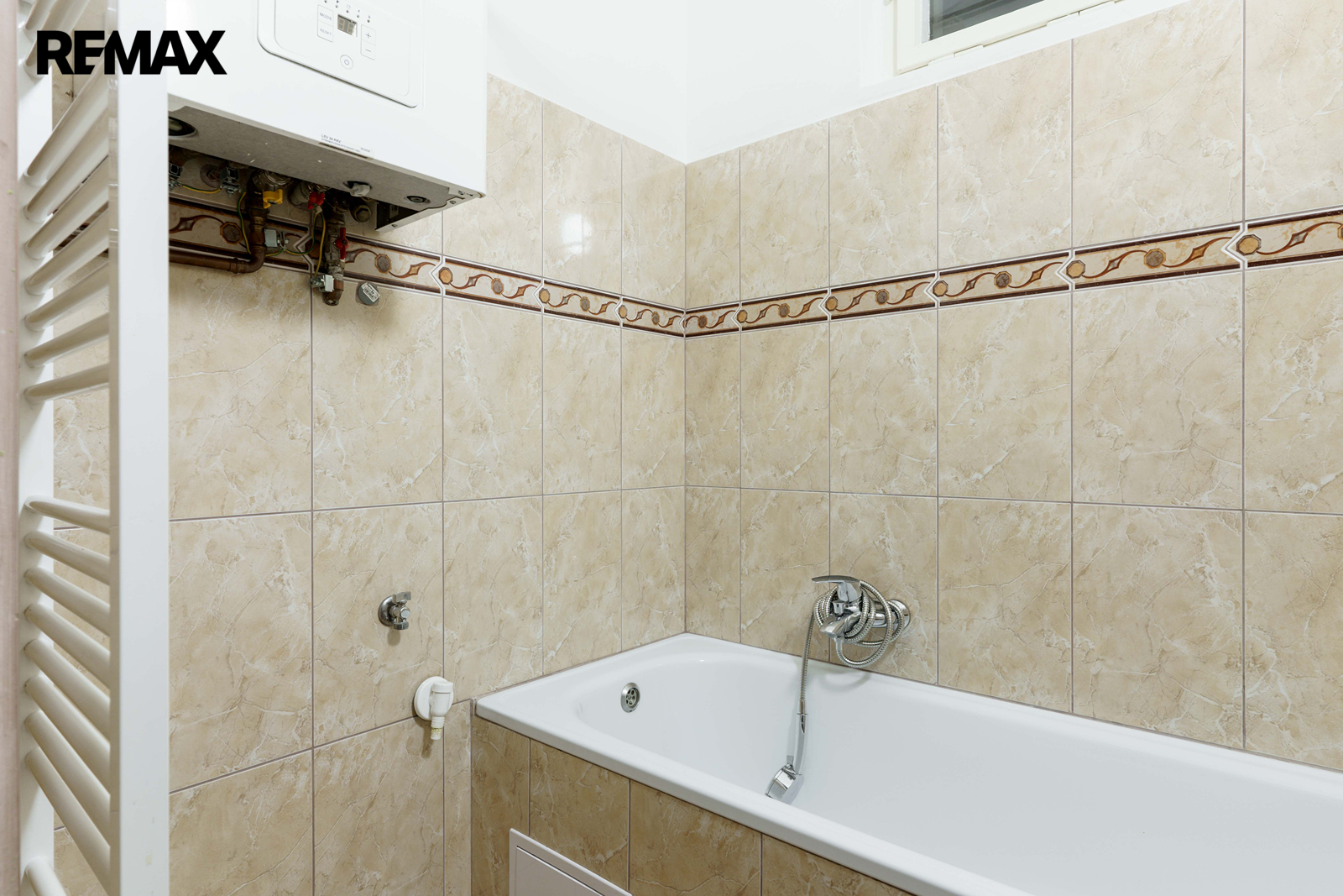 Byt má vlastní plynový kotel zajišťující vytápění a ohřev vody. V kuchyni je ohřev vody zajištěn elektrickým zásobníkovým ohřívačem.
