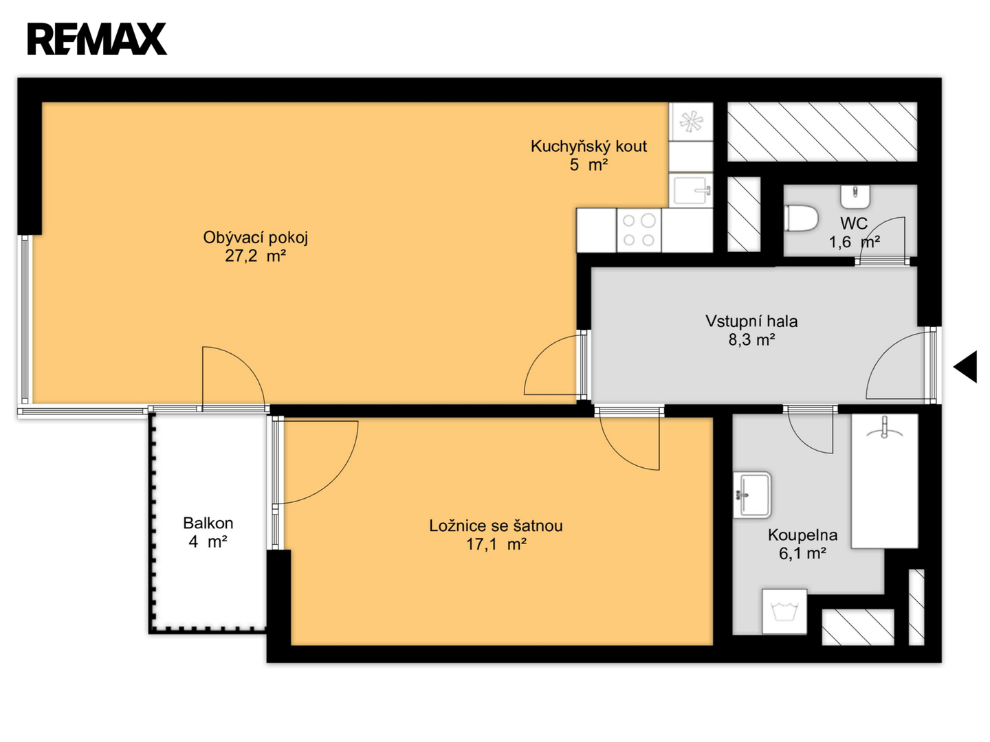Byt disponuje obývacím pokojem s kuchyňským koutem, ložnicí, koupelnou s vanou, samostatným WC a vstupní halou. Z ložnice a z obývacího pokoje je vstup na balkon, který je orientovaný do klidného vnitrobloku.