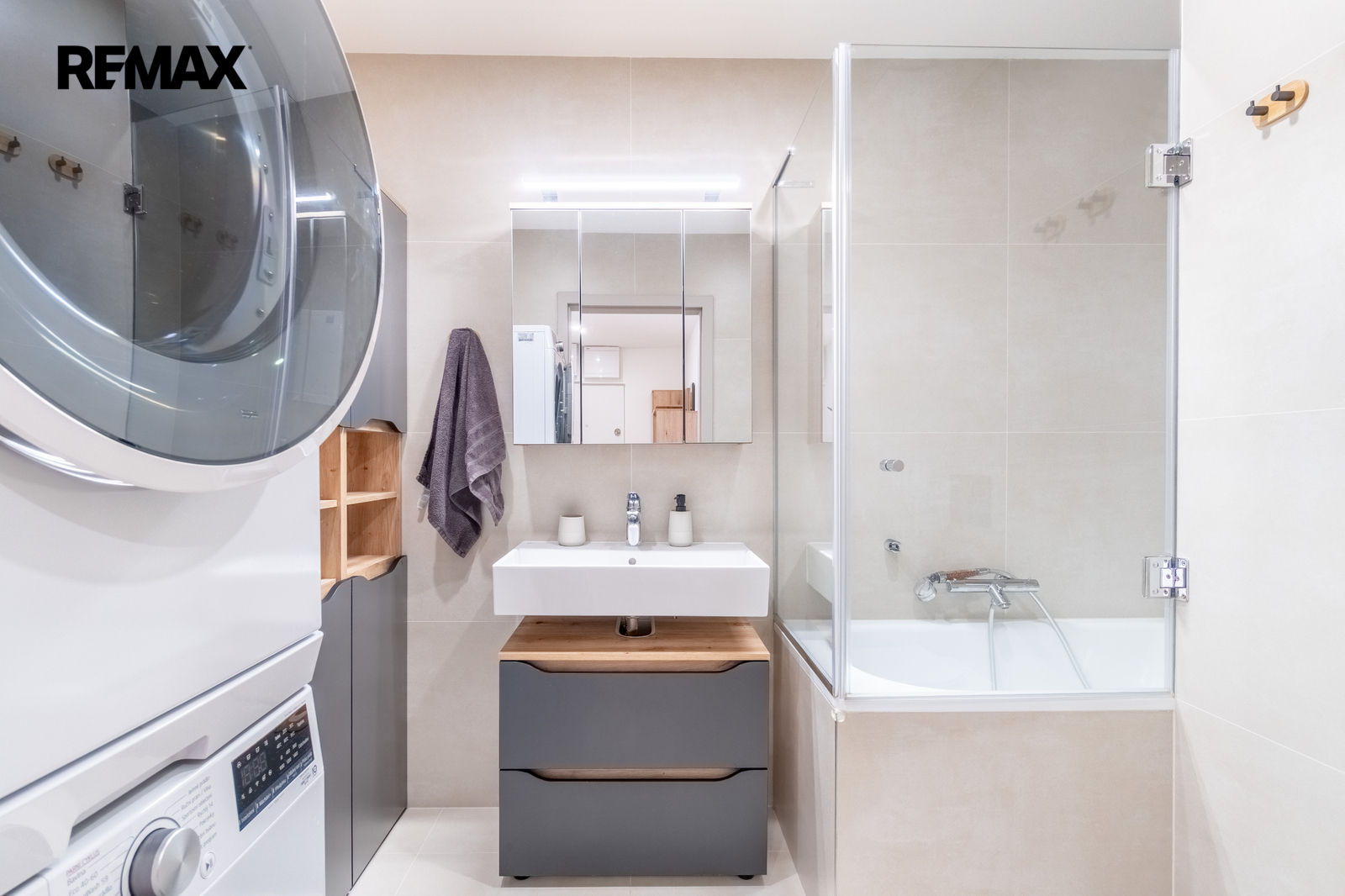 Koupelna: pračka, sušička, velká skříň a dostatek úložných prostor