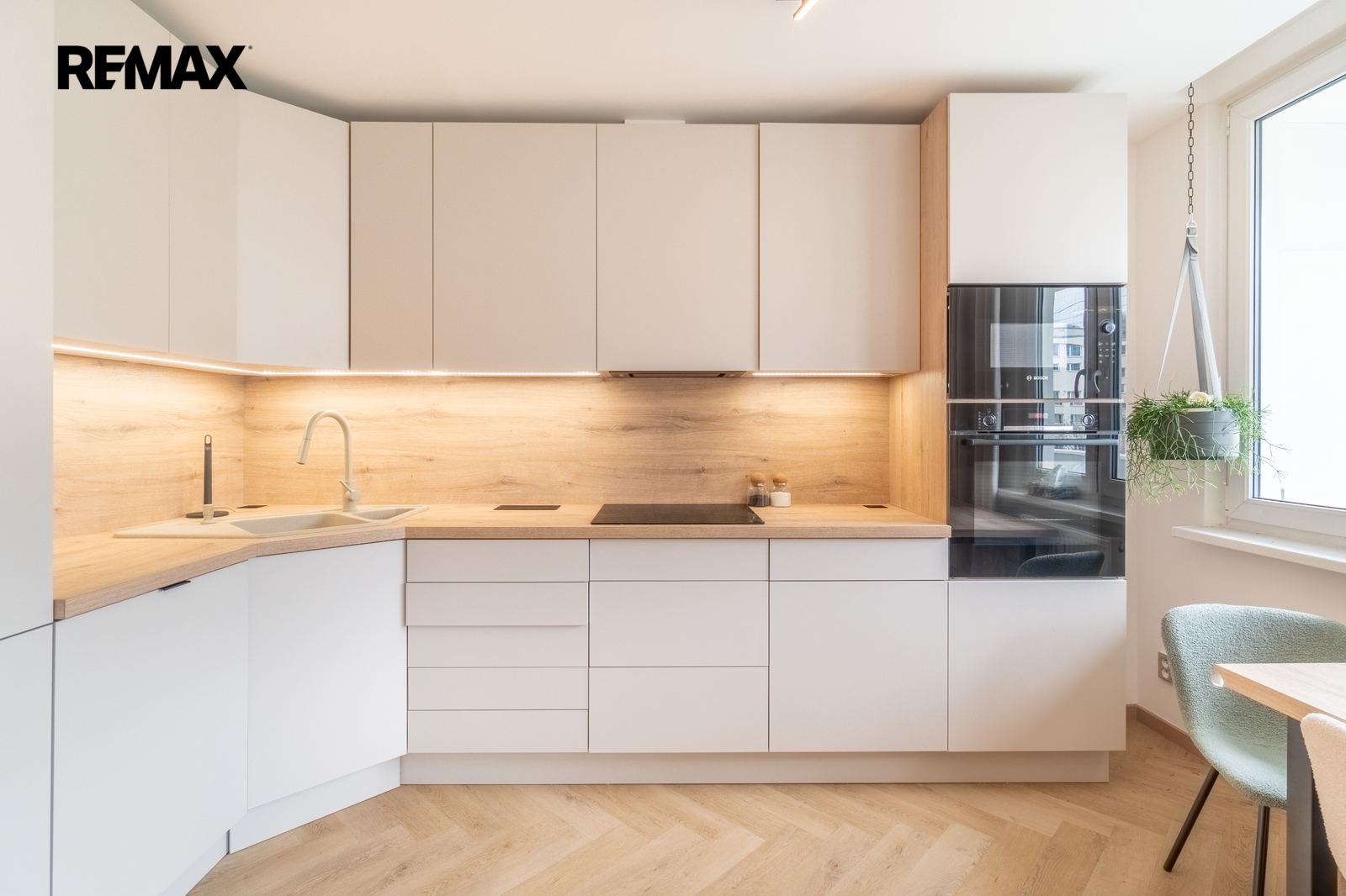 Kuchyně: moderní kuchyňská linka se spotřebiči značky Bosch – myčka, indukční deska, mikrovlnná trouba, lednice