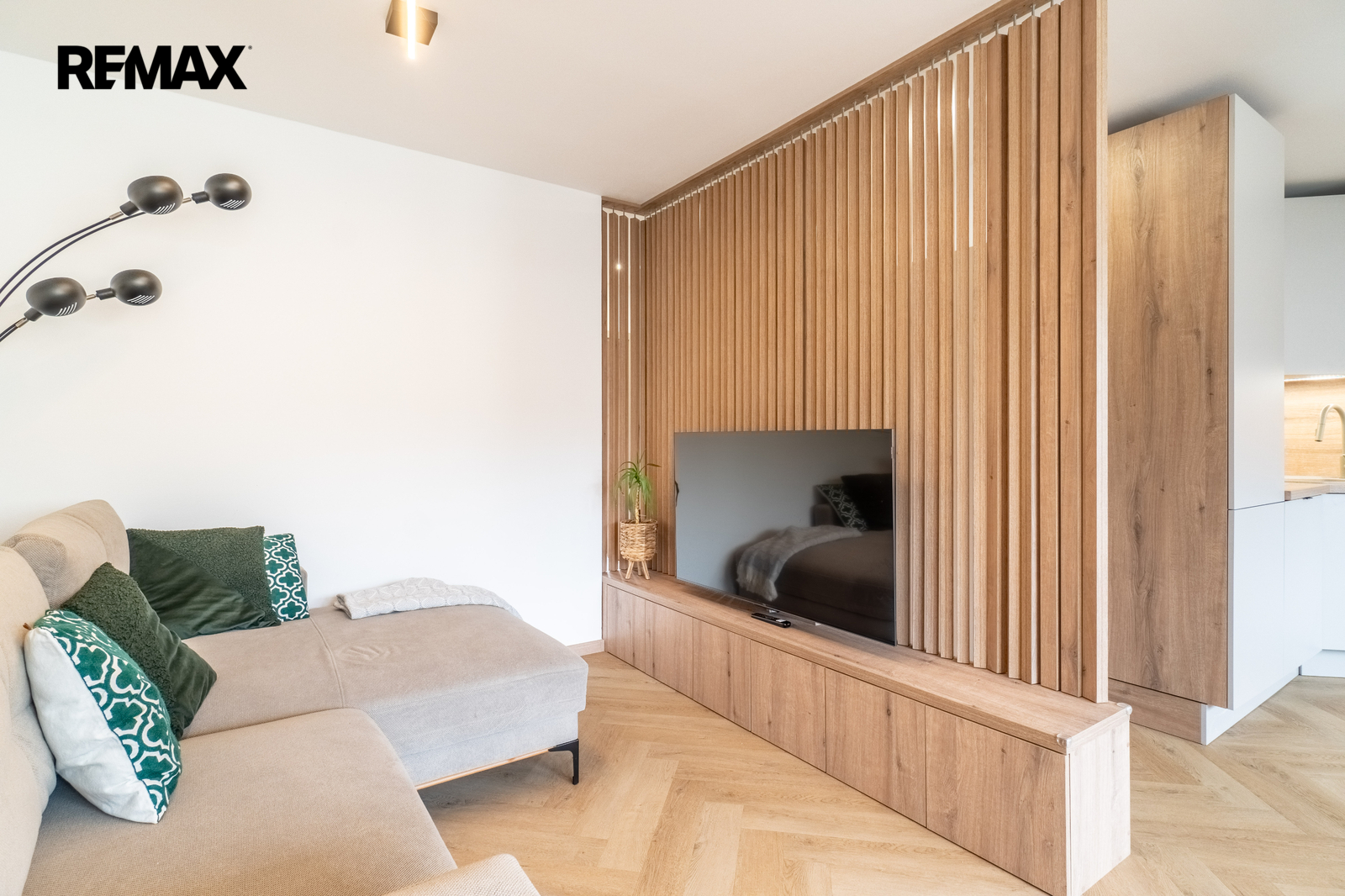 Obývací pokoj: dřevěný regál, gauč, televize