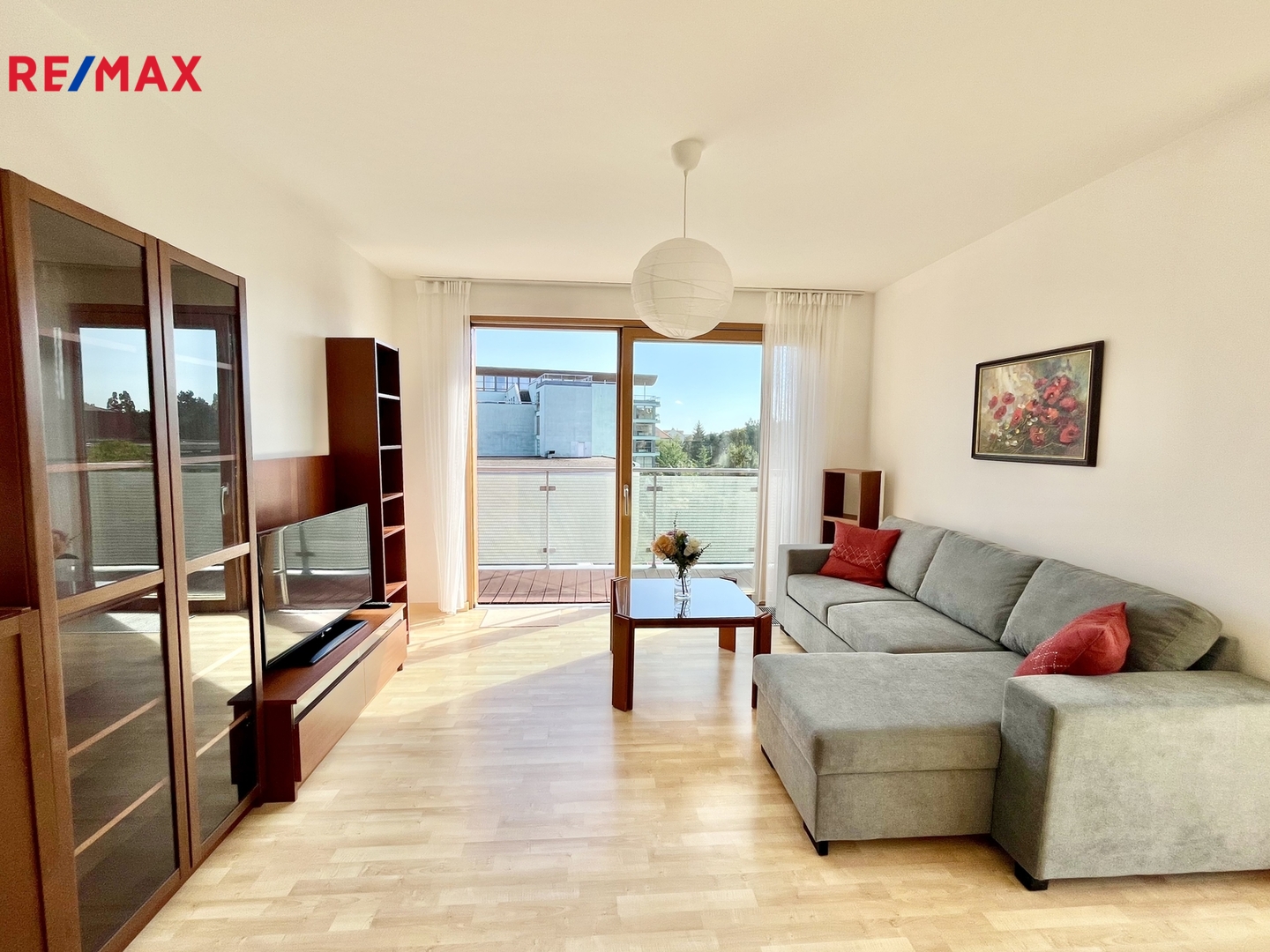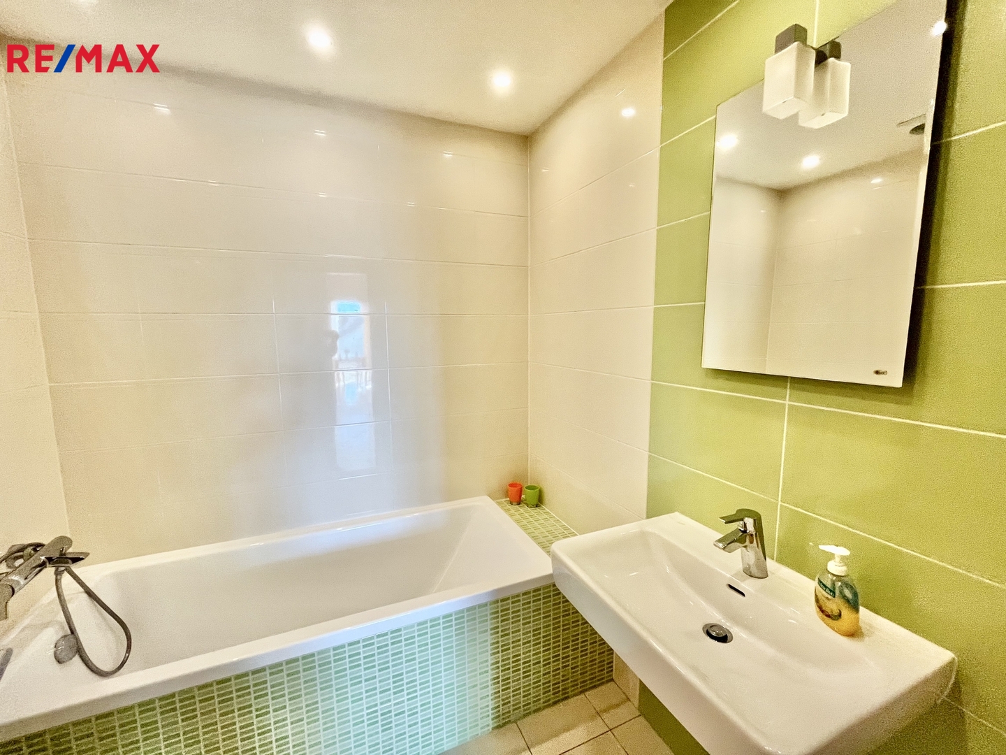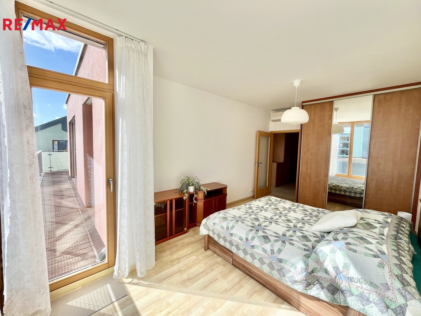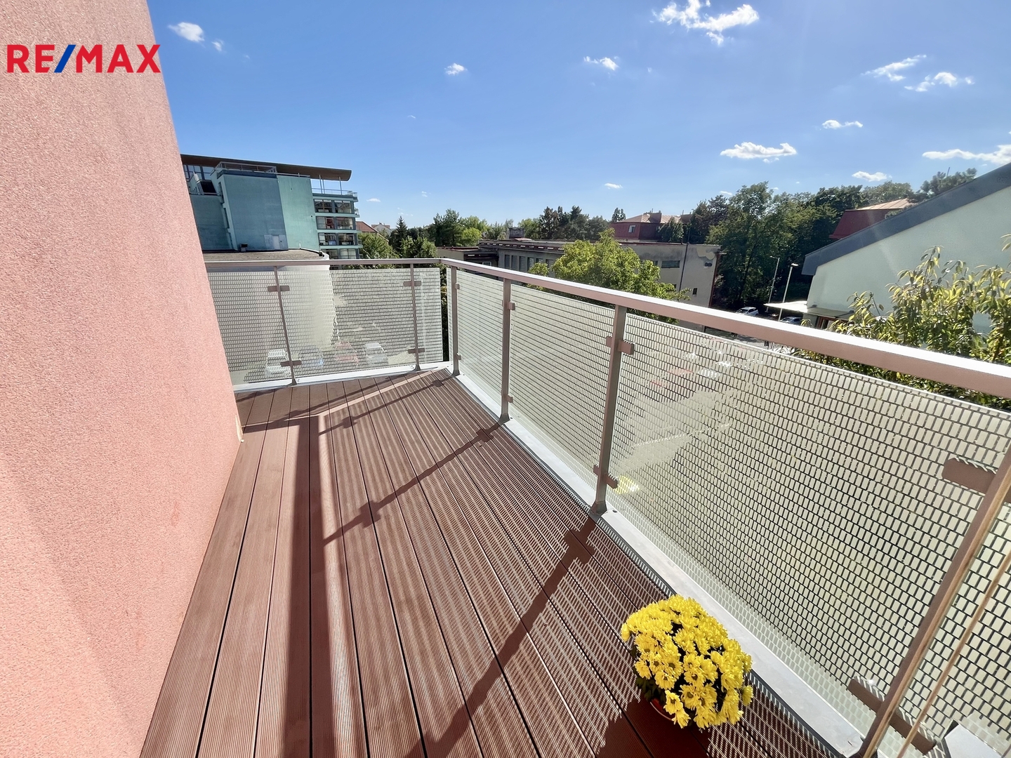 Komfortní, kompletně vybavený 82m² byt s 15m² terasou se nachází ve 3. patře nového viladomu umístěného ve vilkové čtvrti, pár kroků od stanice metra.
