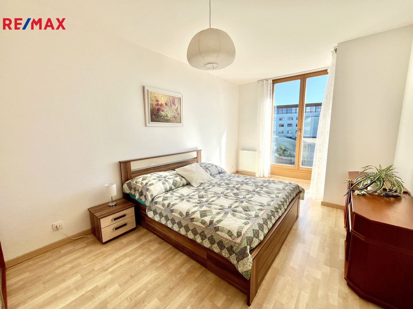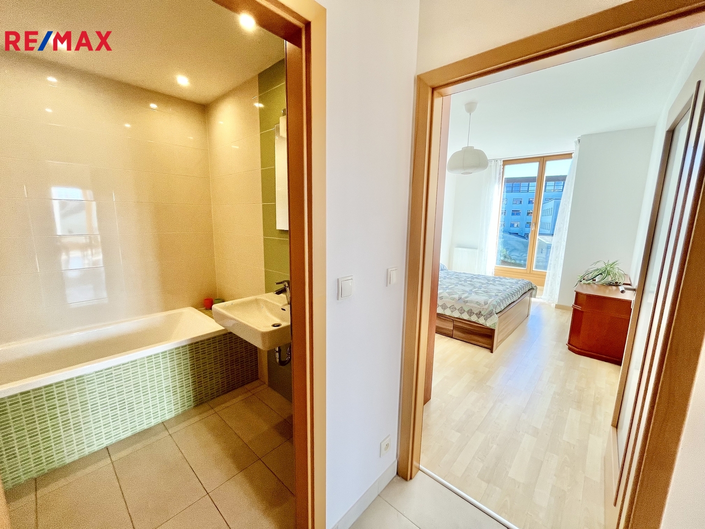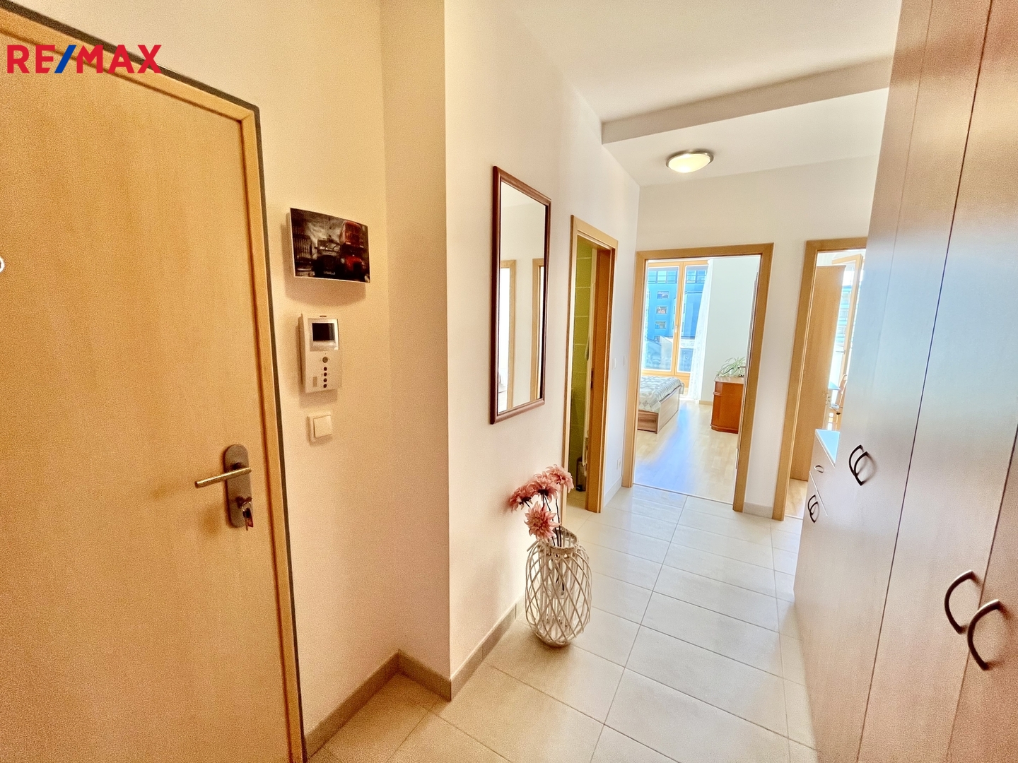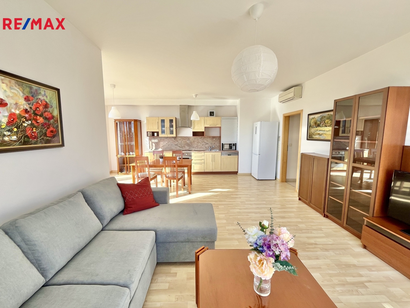 Komfortní, kompletně vybavený 82m² byt s 15m² terasou se nachází ve 3. patře nového viladomu umístěného ve vilkové čtvrti, pár kroků od stanice metra.