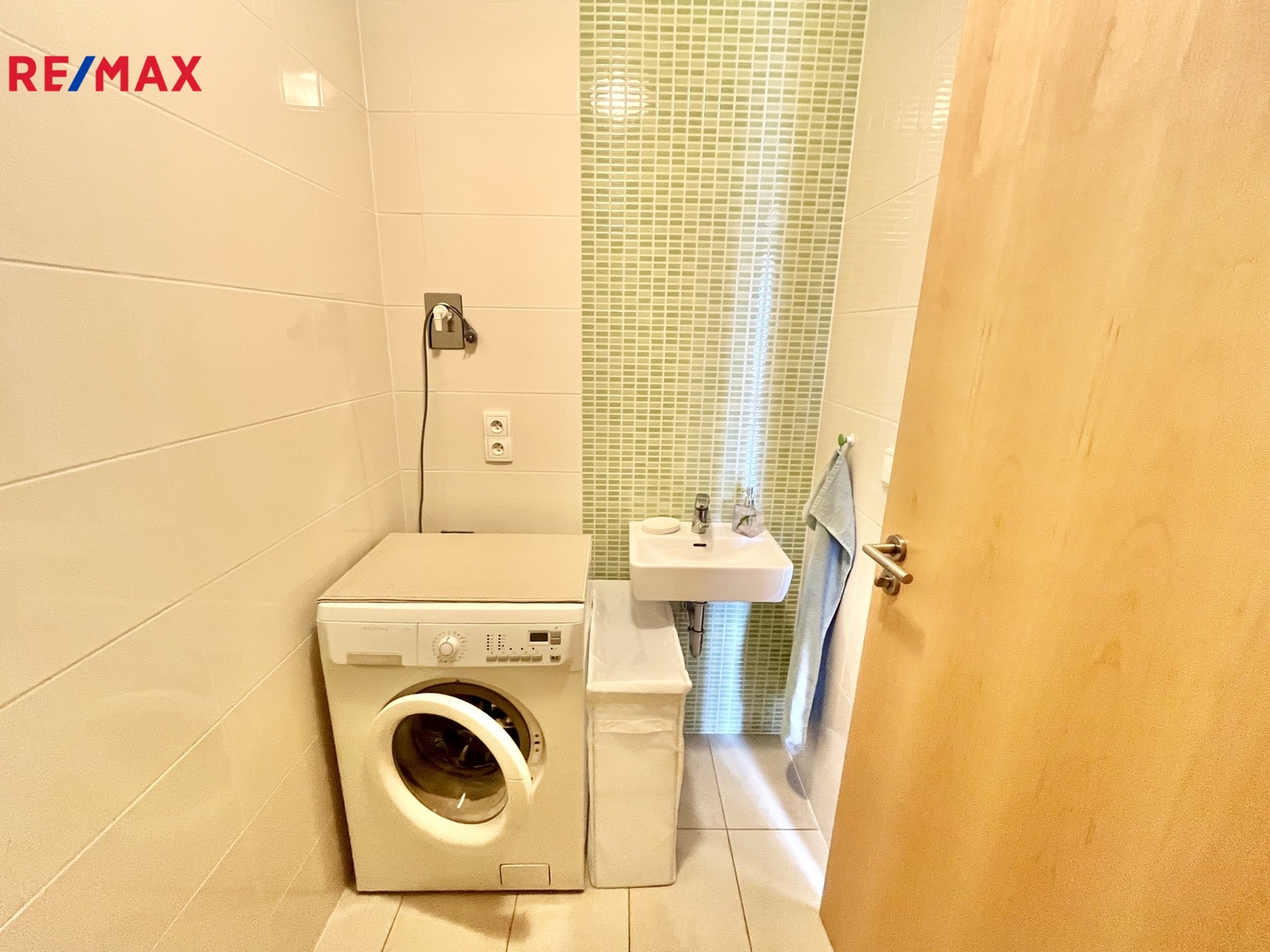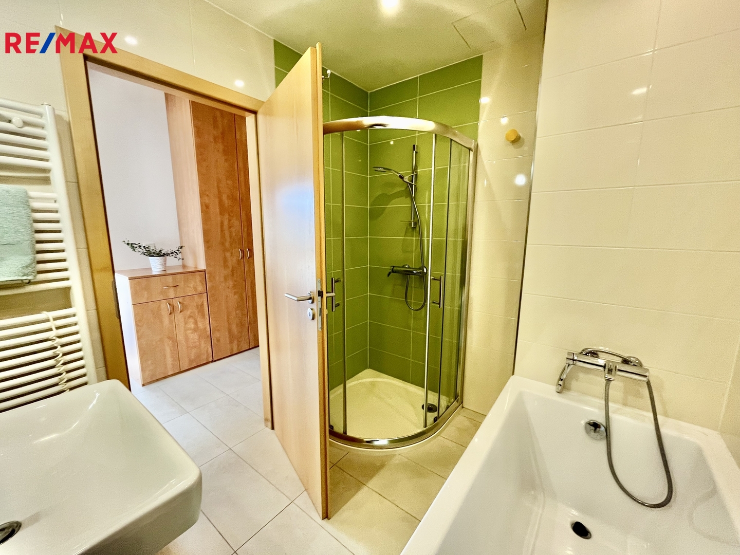 V koupelně je vana i sprchový kout. Toaleta je zvlášť. K dispozici pračka.