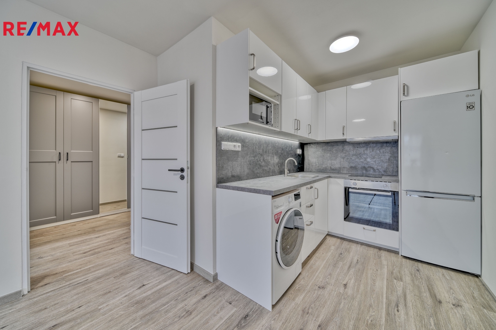 obytný prostor s moderní kuchyňskou linkou vybavenou vestavěnou lednicí s mrazákem, indukční varnou deskou, troubou a pračkou