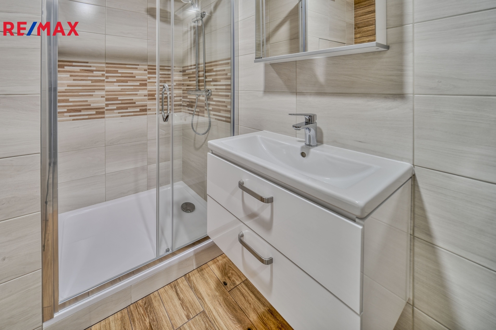koupelna se sprchovým koutem, umyvadlem a WC