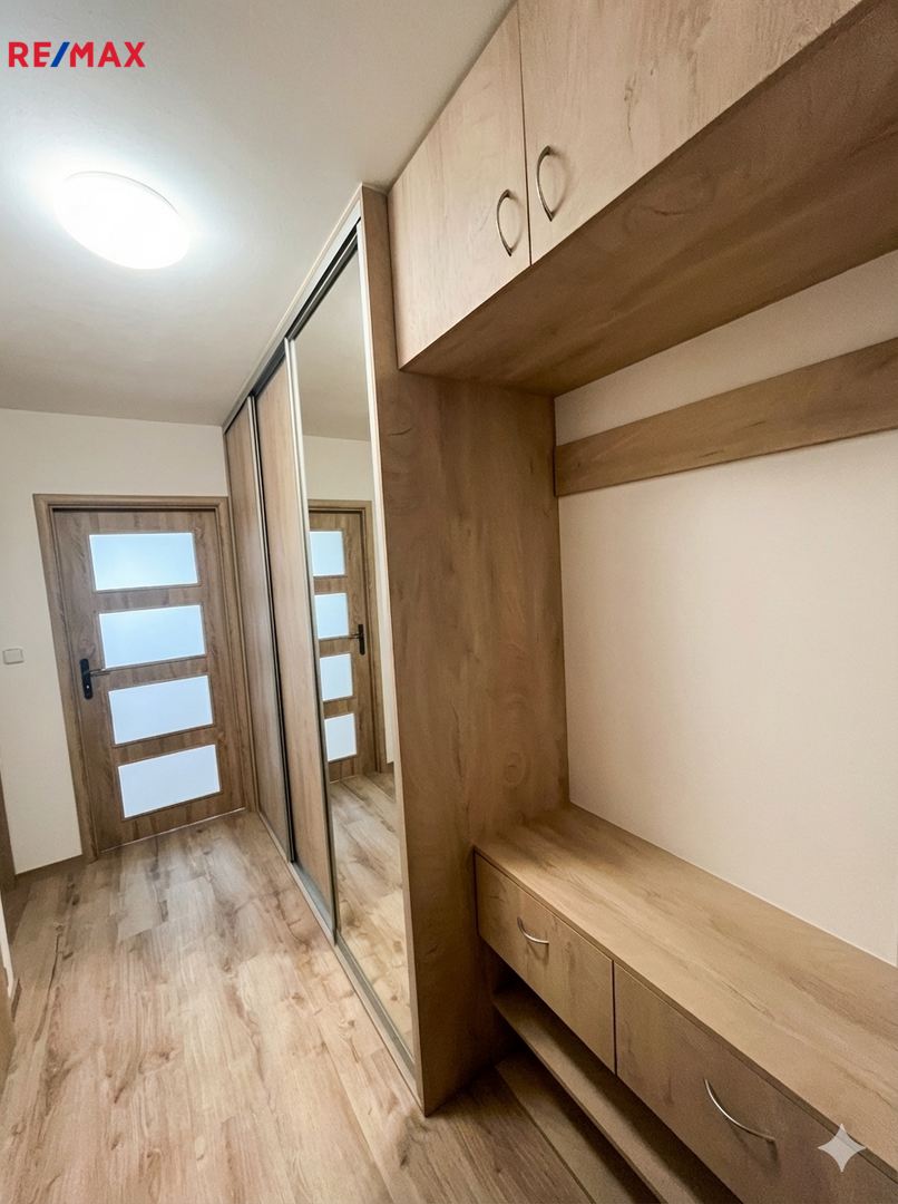 Praktické úložné prostory zajišťují vestavěná skříň v chodbě a další vestavěná skříň v ložnici. Koupelna je moderní, se sprchovým koutem a pračkou.