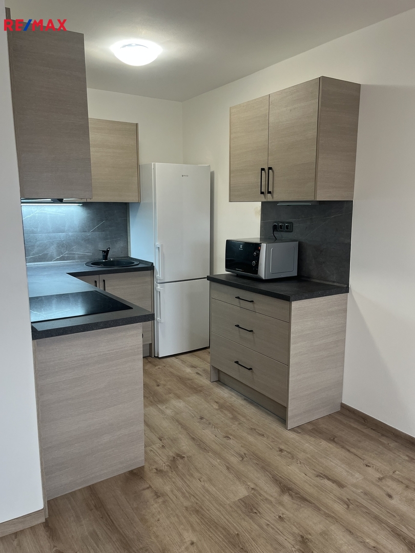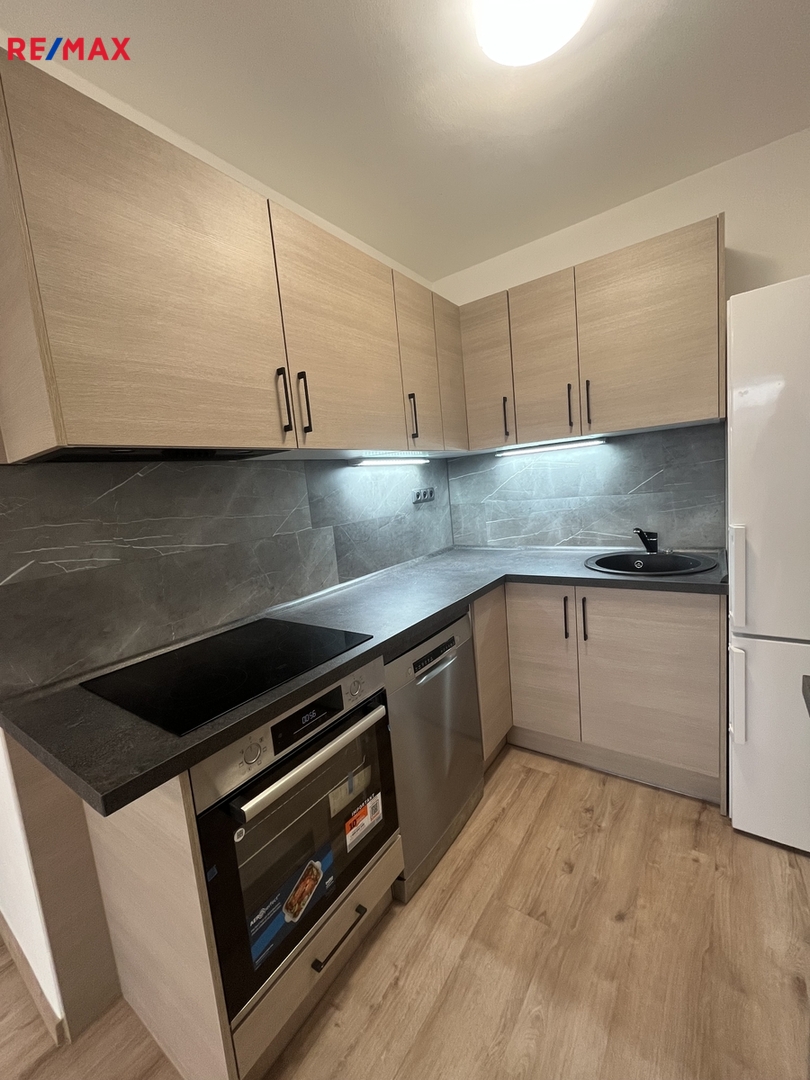 Byt disponuje plně vybavenou kuchyňskou linkou – sklokeramická varná deska, horkovzdušná trouba, myčka nádobí, digestoř, kombinovaná lednice a mikrovlnná trouba.