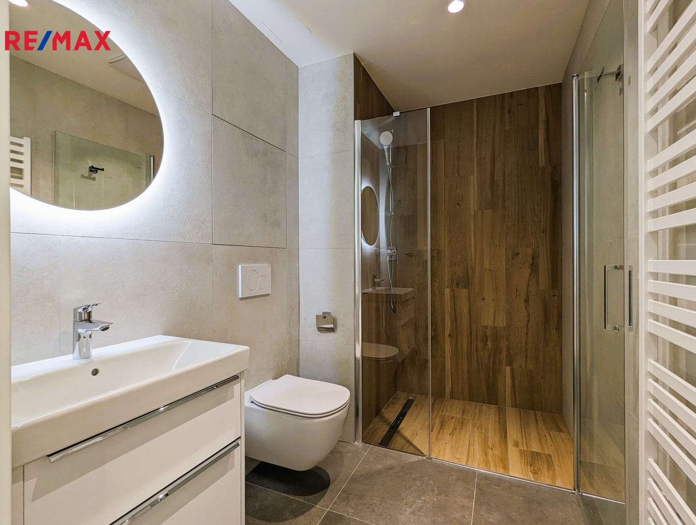 • vybavená koupelna a WC italskými obklady a značkovou sanitou Laufen, Grohe, Hüppe, Geberit