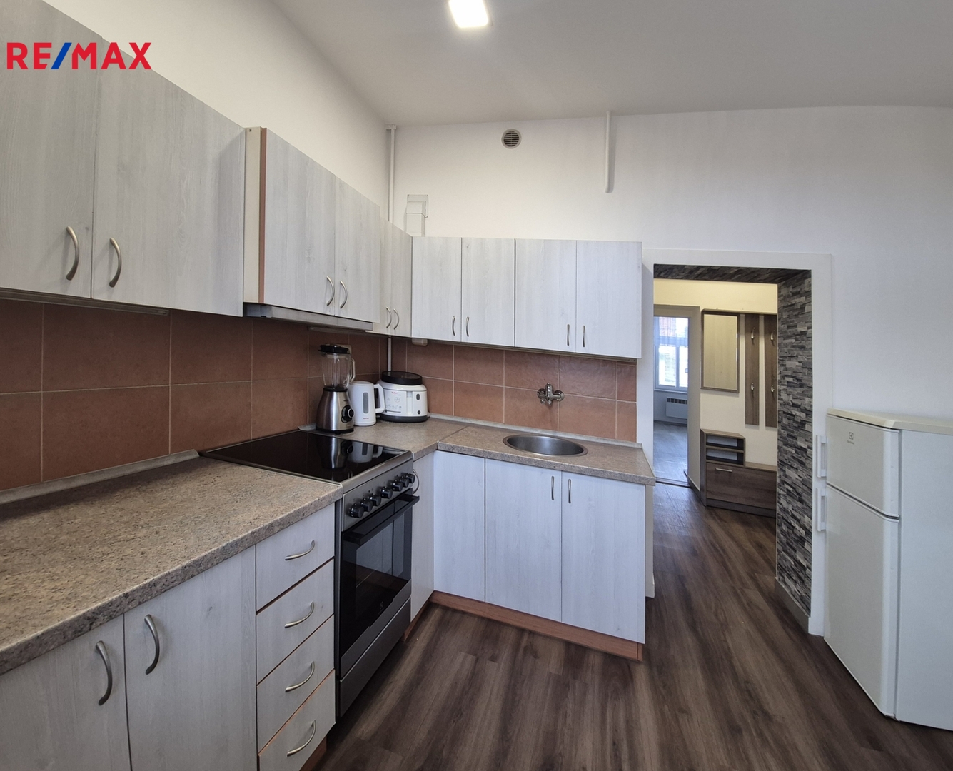 Kuchyň je vybavena chladničkou s mrazničkou, v koupelně je pračka.