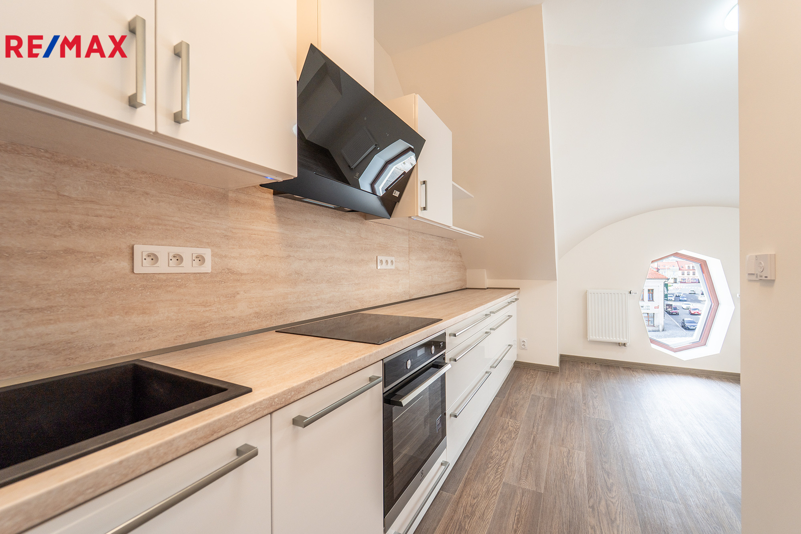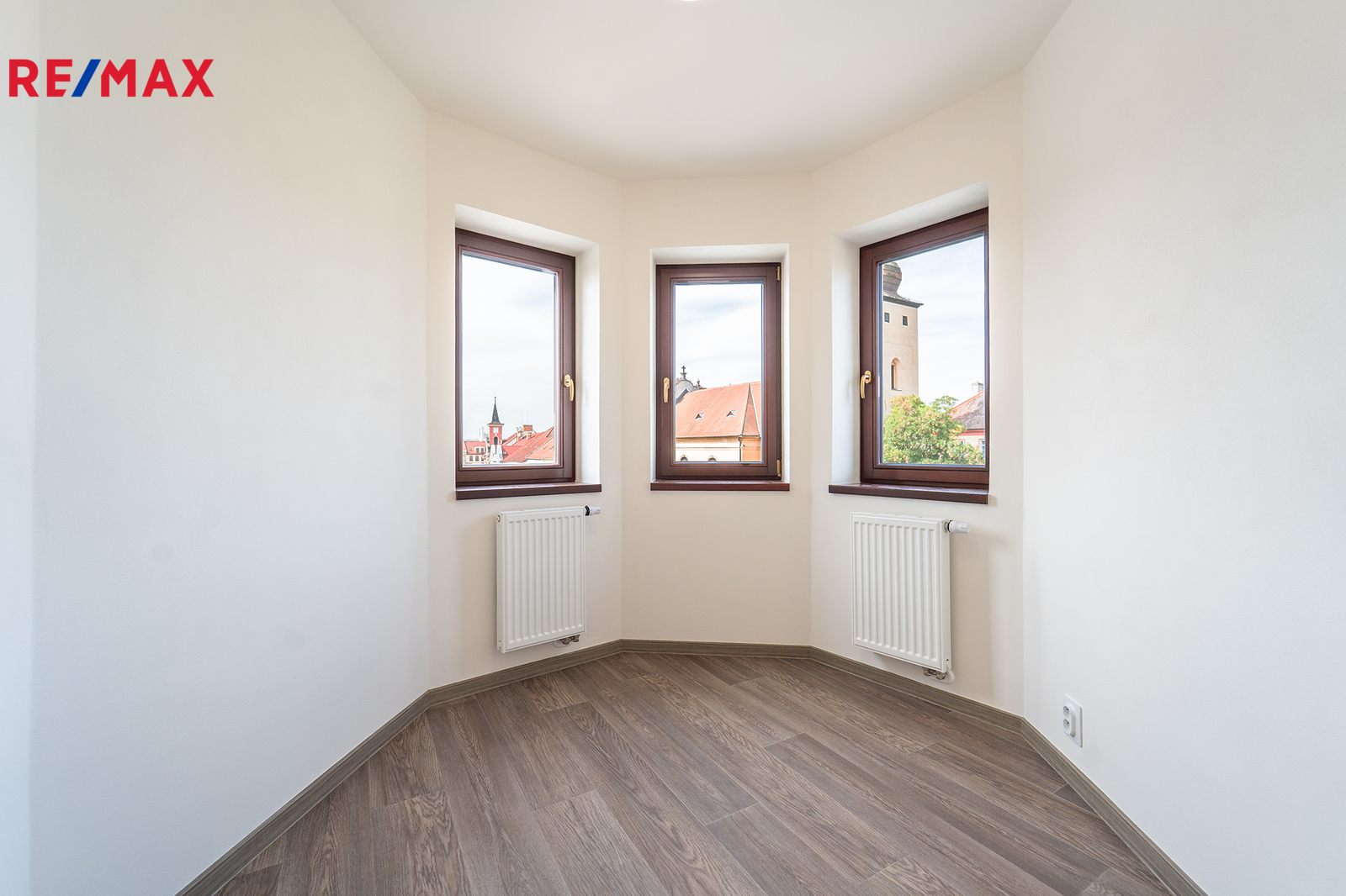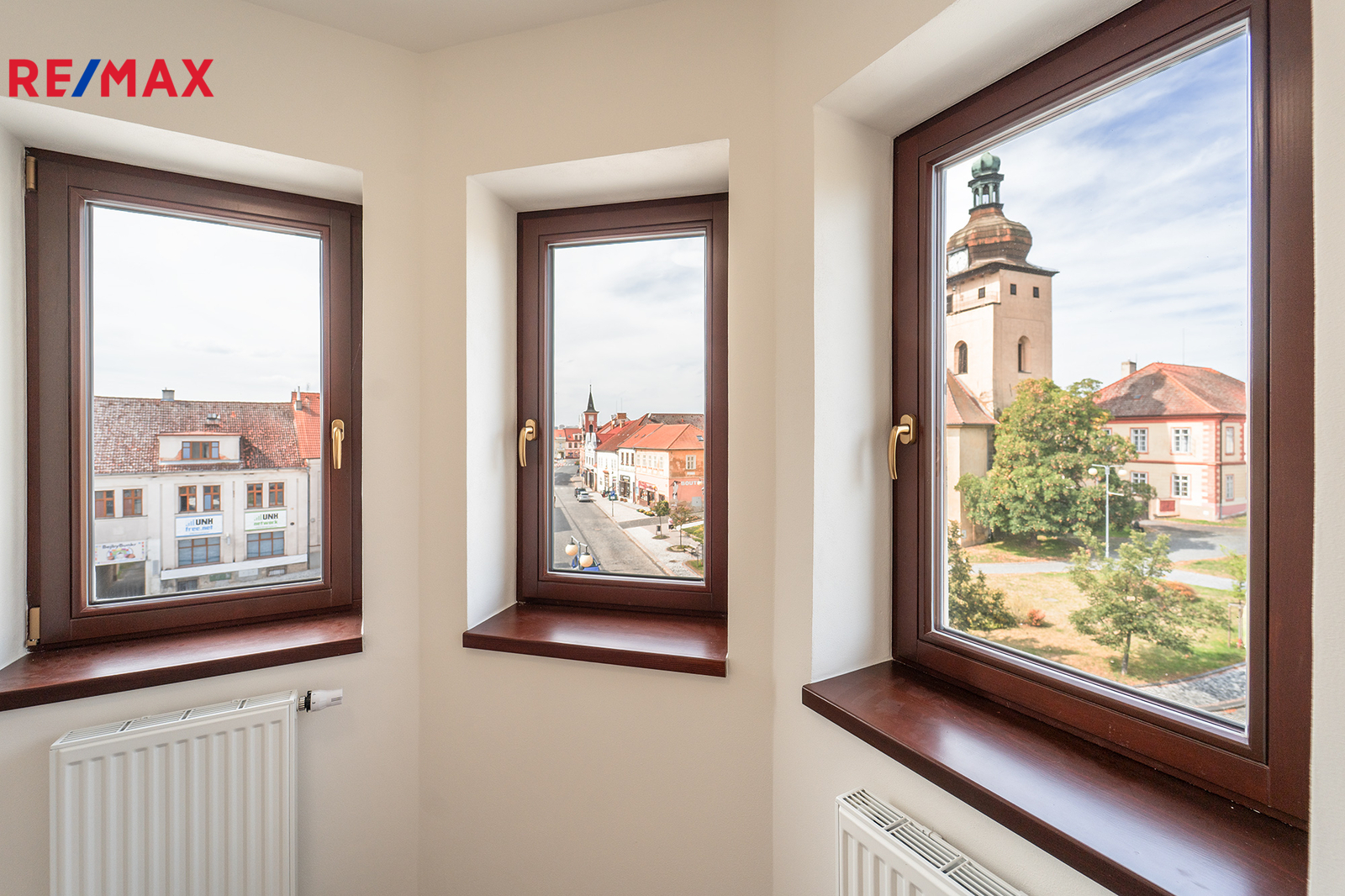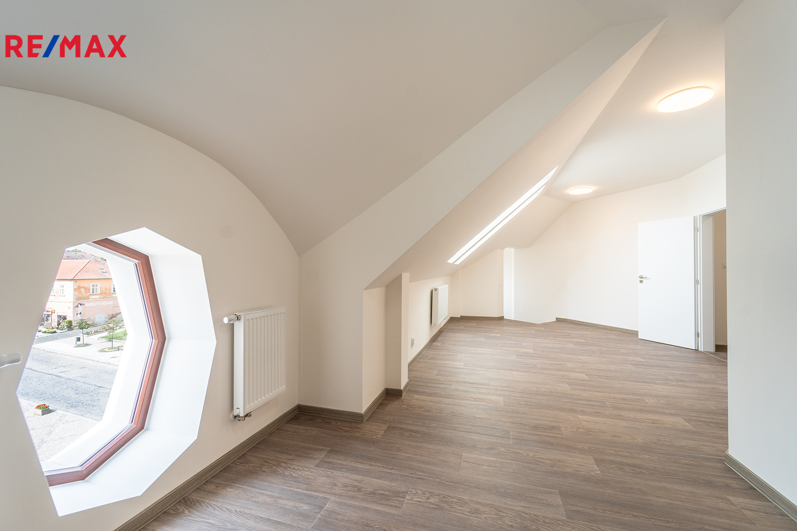 Dispozičně tu máte prostorný obývák s moderním kuchyňským koutem, kde se už těší vestavěná indukce, trouba, mikrovlnka i digestoř. K tomu jedna ložnice, koupelna s vanou a toaletou. Co je zde unikátní, tak to je místnost ve věžičce v rohu domu - ideální prostor pro pracovnu, kde vás bude rozptylovat výhled na náměstí.