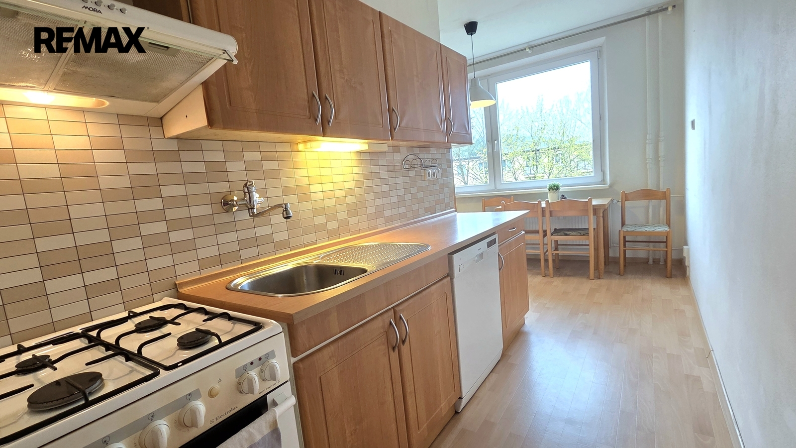 K dispozici je zrekonstruovaná kuchyně s vestavnými spotřebiči (myčka, plynový sporák s elektrickou troubou, digestoř, lednice s mrazákem, mikrovlnná trouba) a jídelním stolem se židlemi.