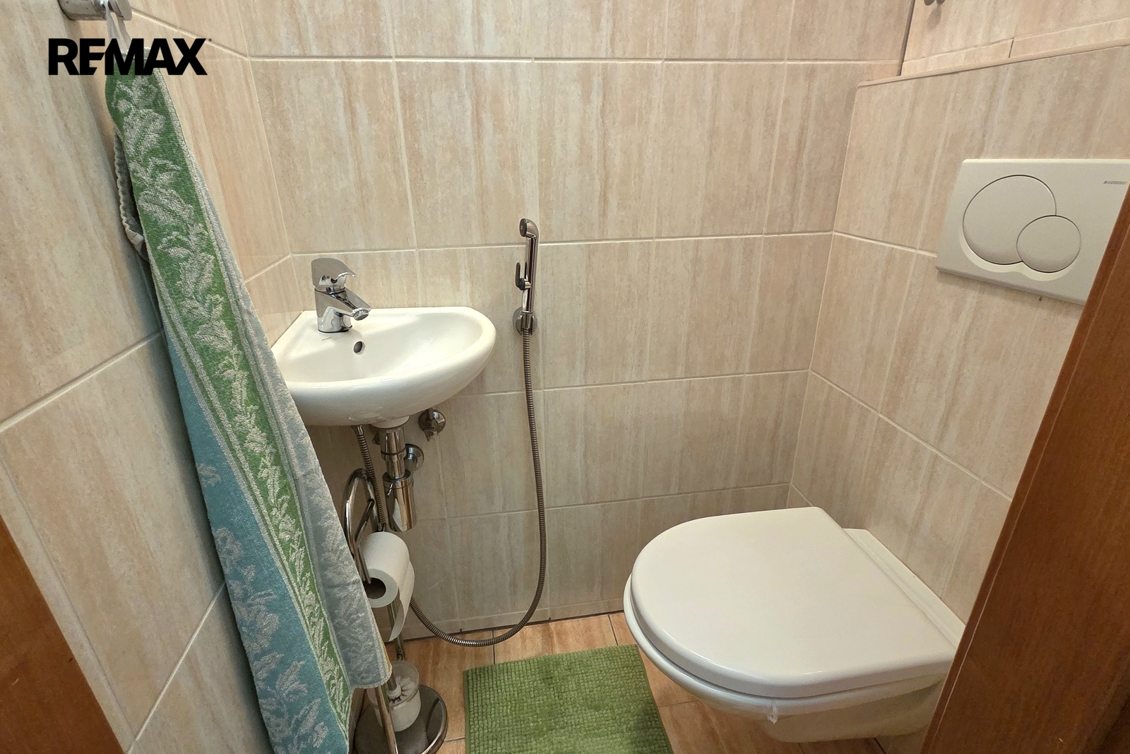 Koupelna je samostatná s vanou, otopným žebříkem a pračkou, toaleta je oddělená a vybavená sprškou.