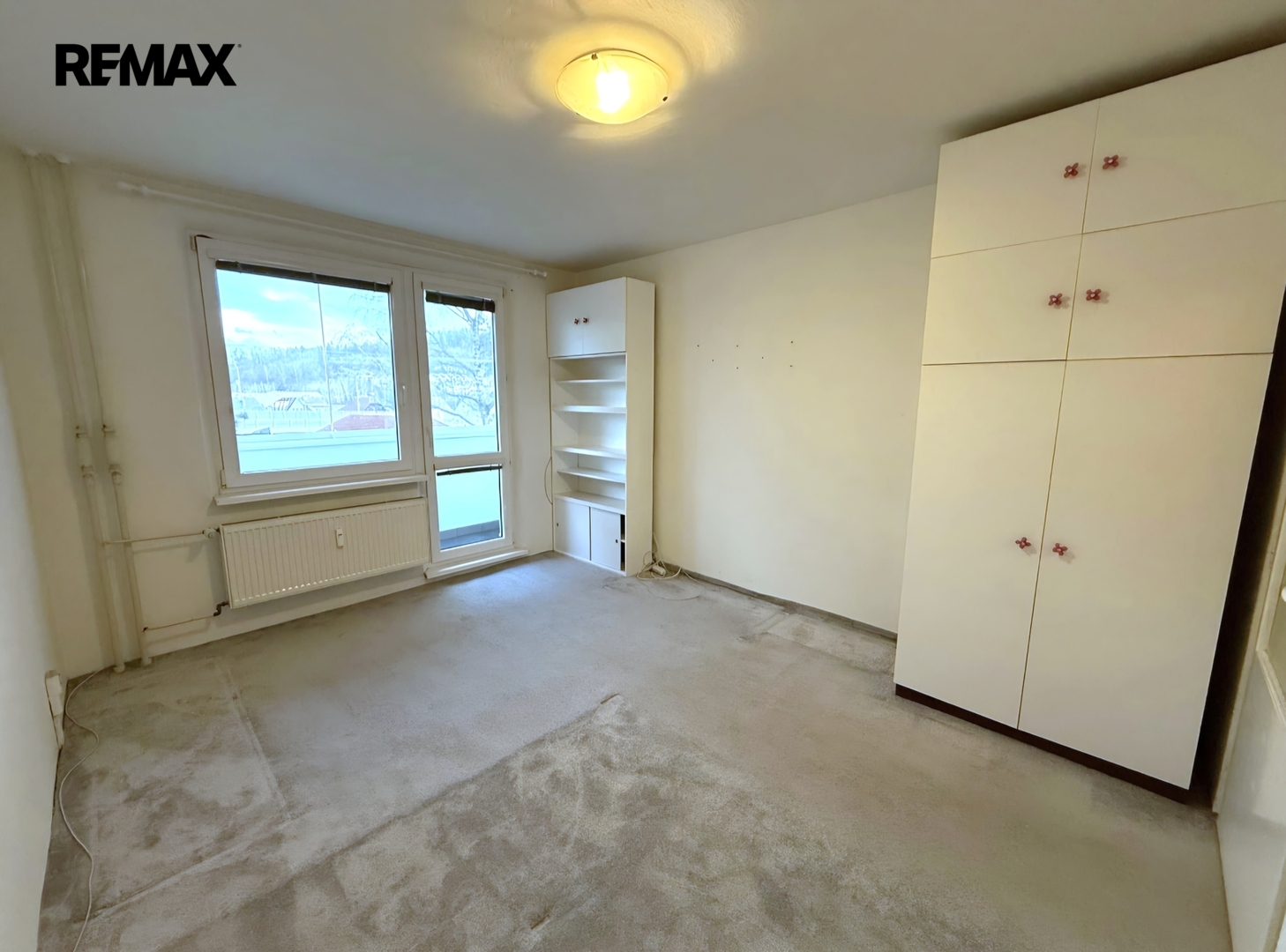 Obývací pokoj a ložnice jsou částečně vybavené (koberce, skříně). Byt je jinak nezařízený. Součástí je také praktická komora.