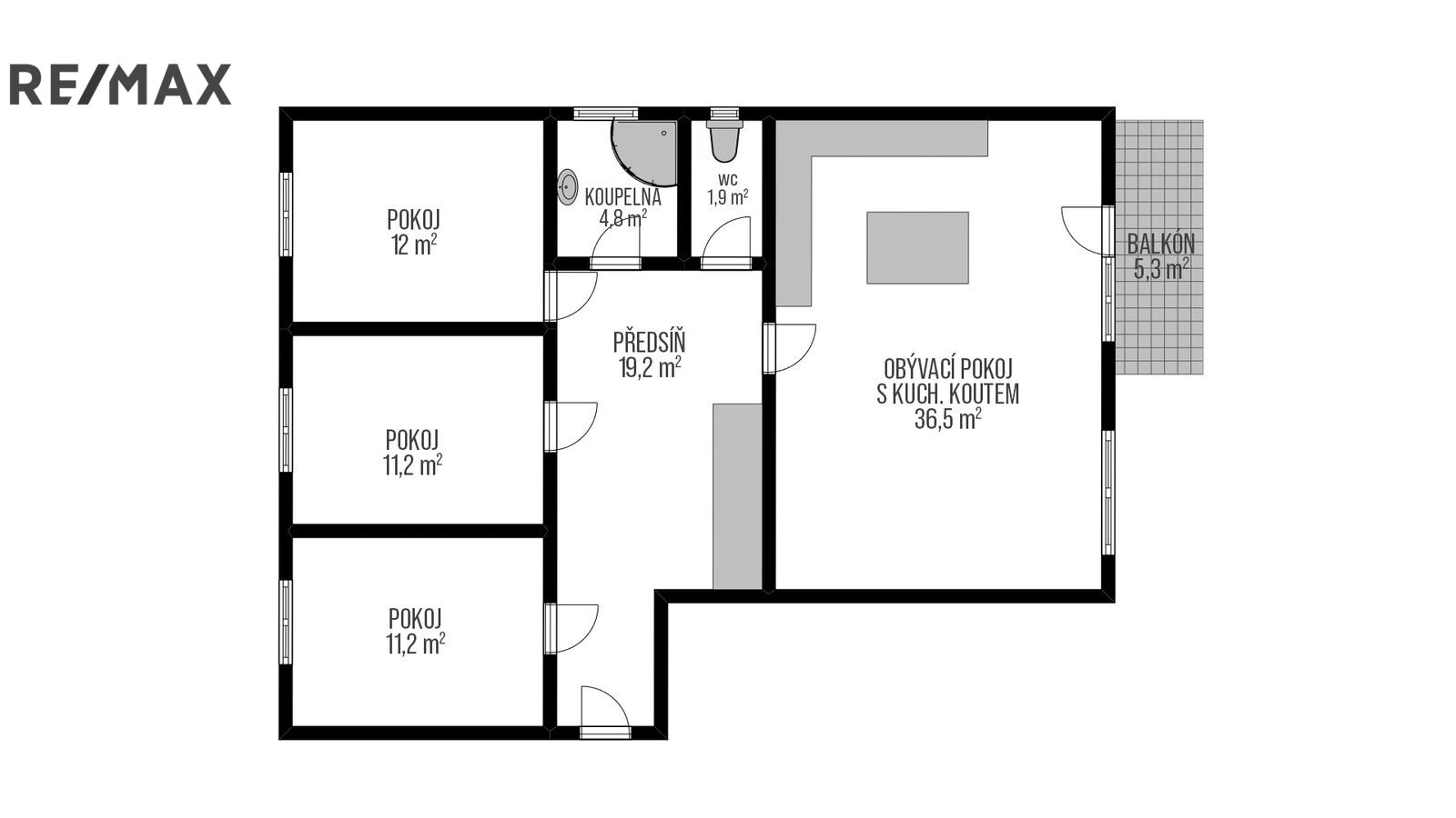 Byt se nachází ve 3. podlaží 4-podlažní budovy bez výtahu a disponuje podlahovou plochou 103 m², z čehož je užitná plocha 97 m² a plocha balkonu 5 m².