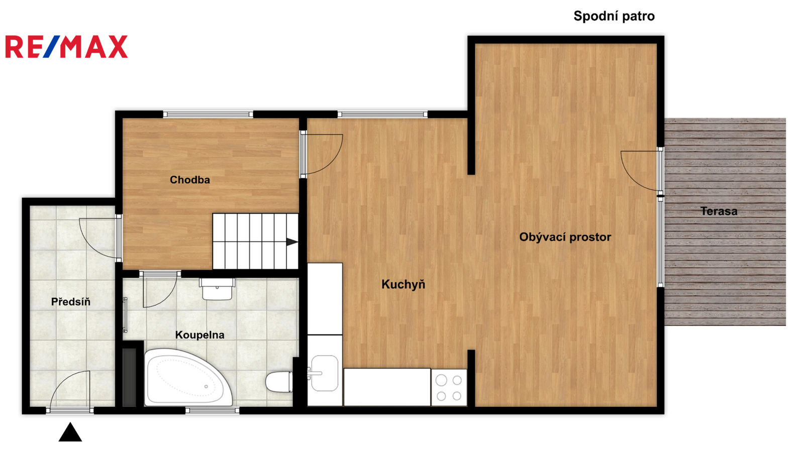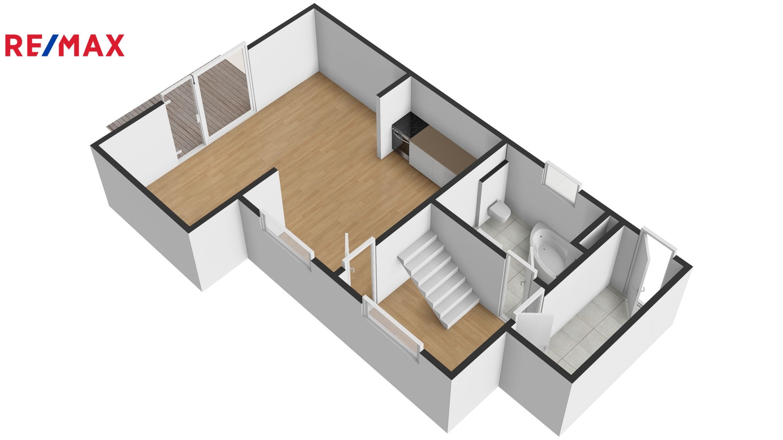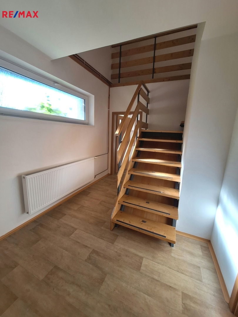 1. NP - vstupní předsíň, chodba se schodištěm do 2. NP, kuchyně, obývací pokoj se vstupem na terasu a zahradu, prostorná koupelna s WC.