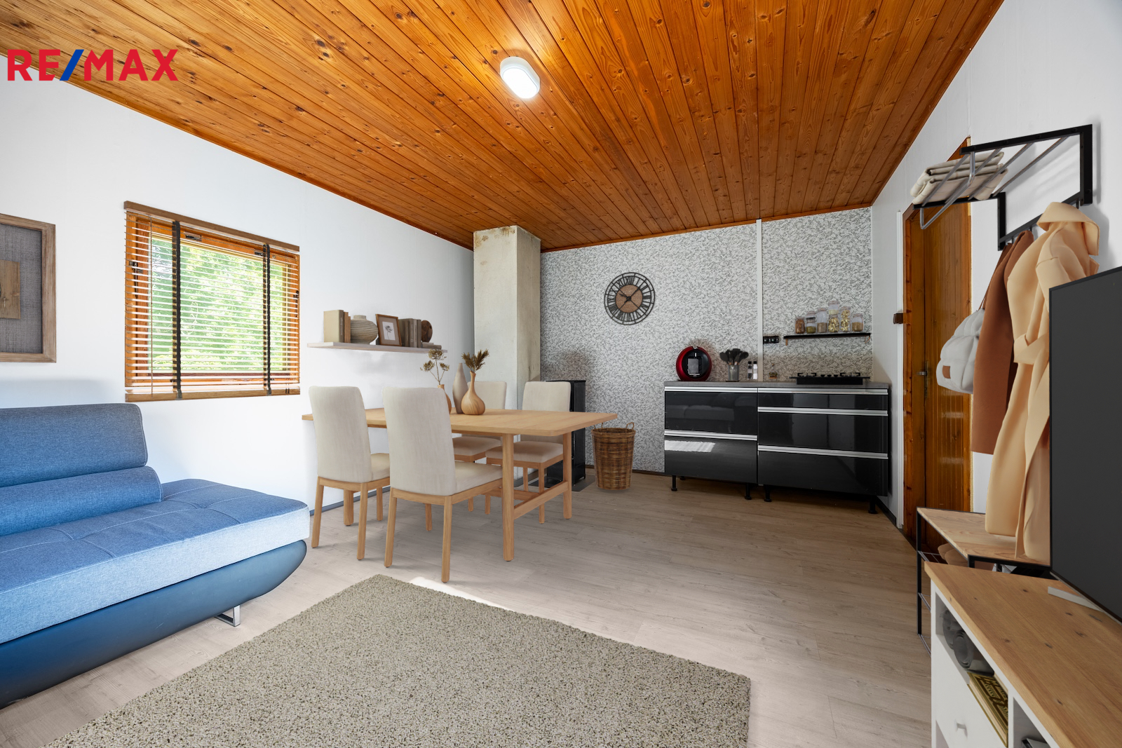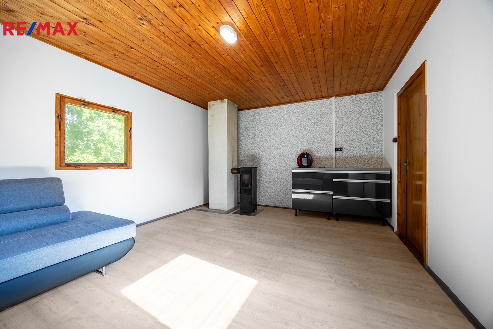 1NP slouží jako obytná místnost, k dispozici je rozkládací pohovka, částečně zařízený kuchyňský kout a komoda.