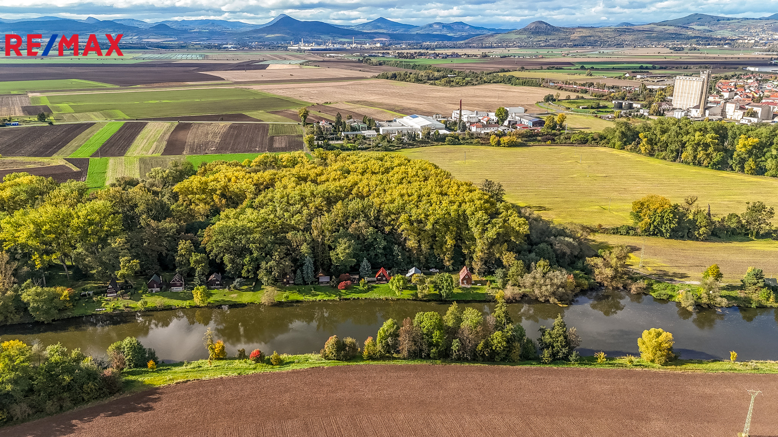 Pozemek je rovinatý, obklopený zelení a umožňuje parkování přímo u chaty. Okolní prostředí působí velmi poklidně, přesto je veškerá občanská vybavenost v dosahu – do Lovosic se dostanete za 10 minut, do Litoměřic za pouhých 15 minut.