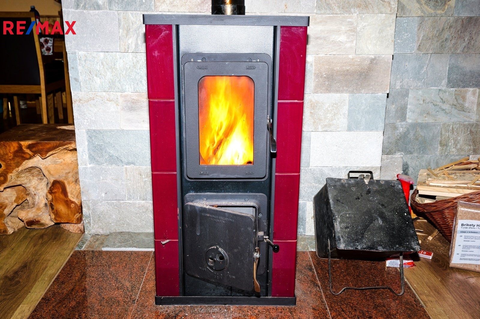 V obývací části jsou kamna na tuhá paliva. Komínové těleso prochází všemi hlavními místnostmi včetně kuchyně, takže stačí zatopit v těchto kamnech a teplo se rovnoměrně rozvine po celé chatě. Díky tomu je chatu možné komfortně užívat i v chladnějších měsících.