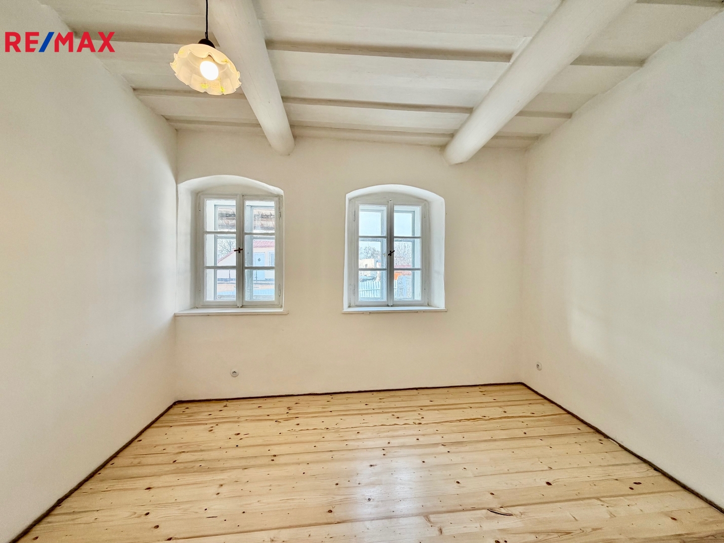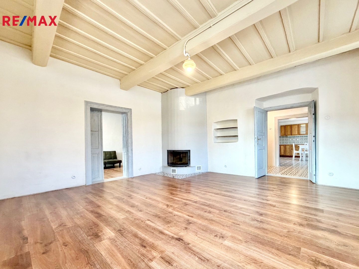 Obývací pokoj s přiznanými trámy a krbem je svatyní klidu. Představte si podzimní večery s knihou u ohně nebo dlouhé hovory s přáteli pod masivními stropy, které pamatují příběhy generací, ale díky rekonstrukci září novotou.
