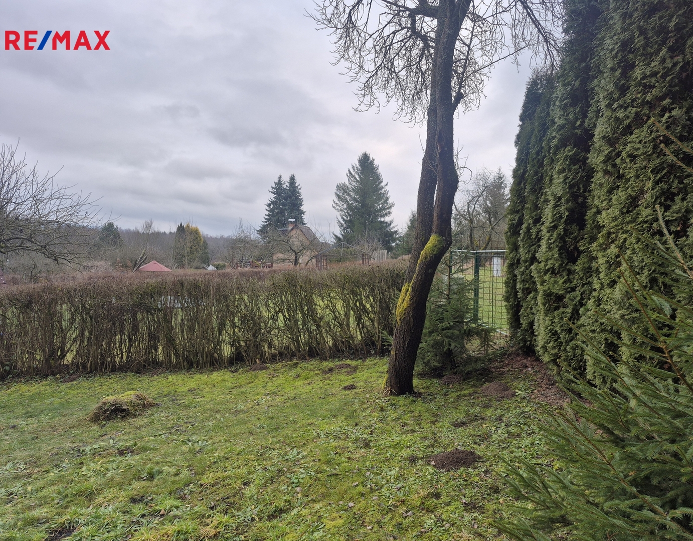 Na zahradě se nacházejí ovocné keře a stromy.