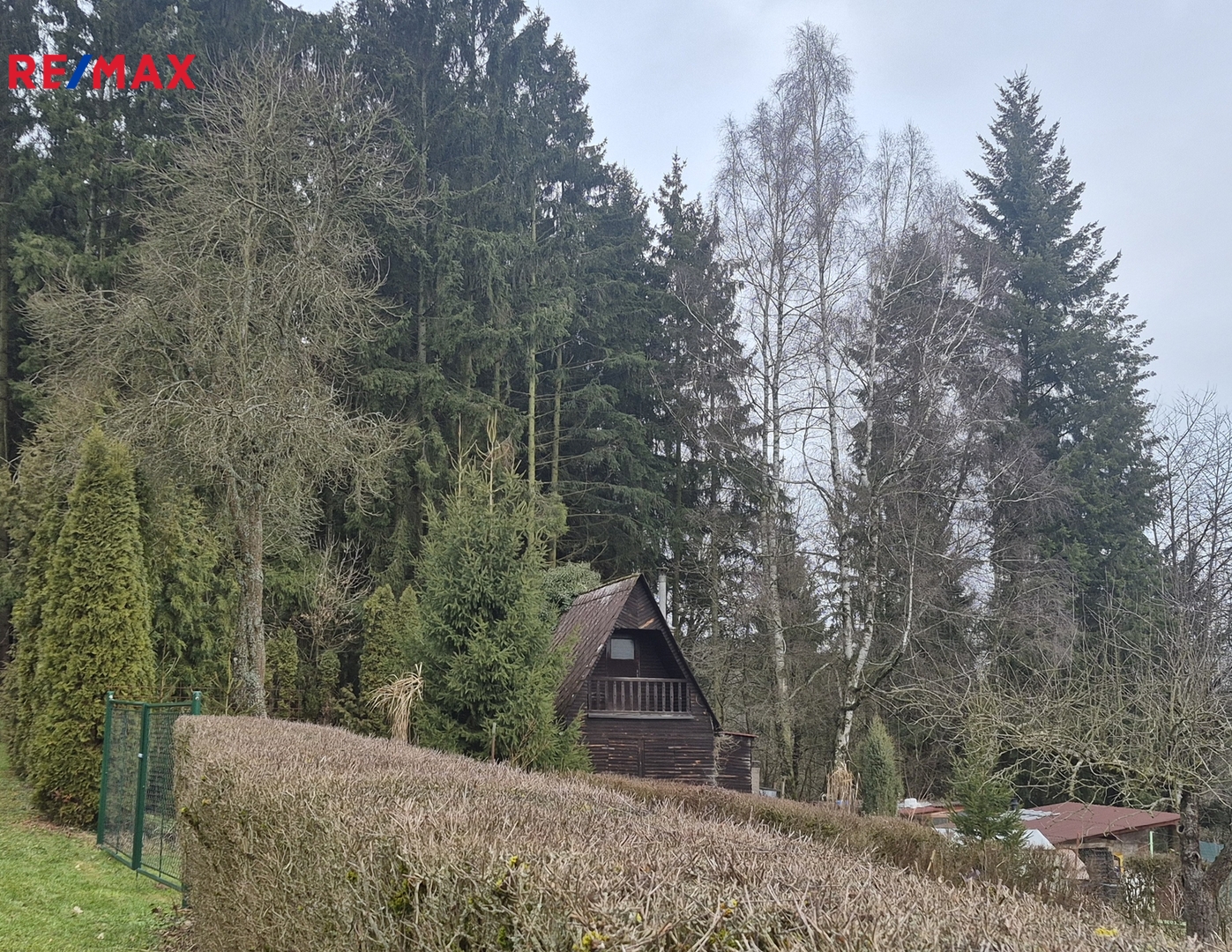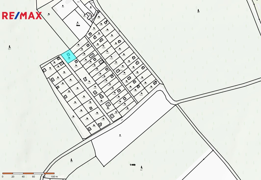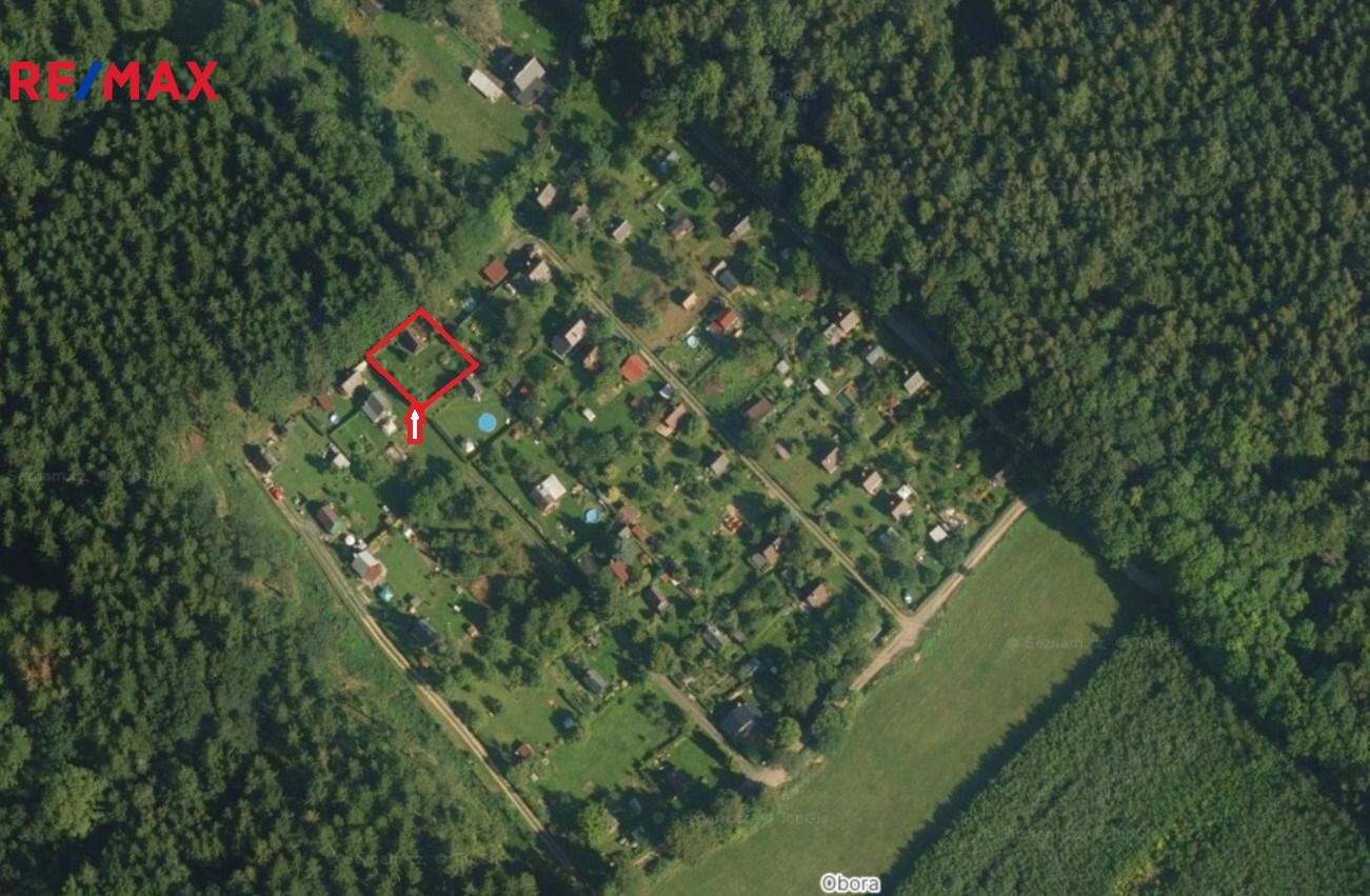 K chatě patří udržovaná oplocená zahrada téměř rovinatého terénu o výměře 404 m2.