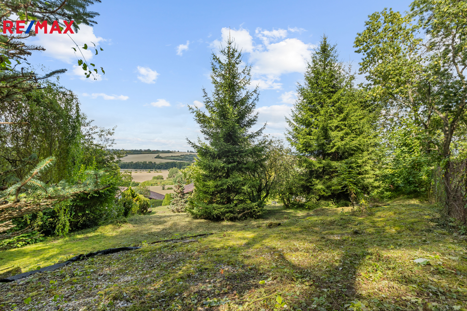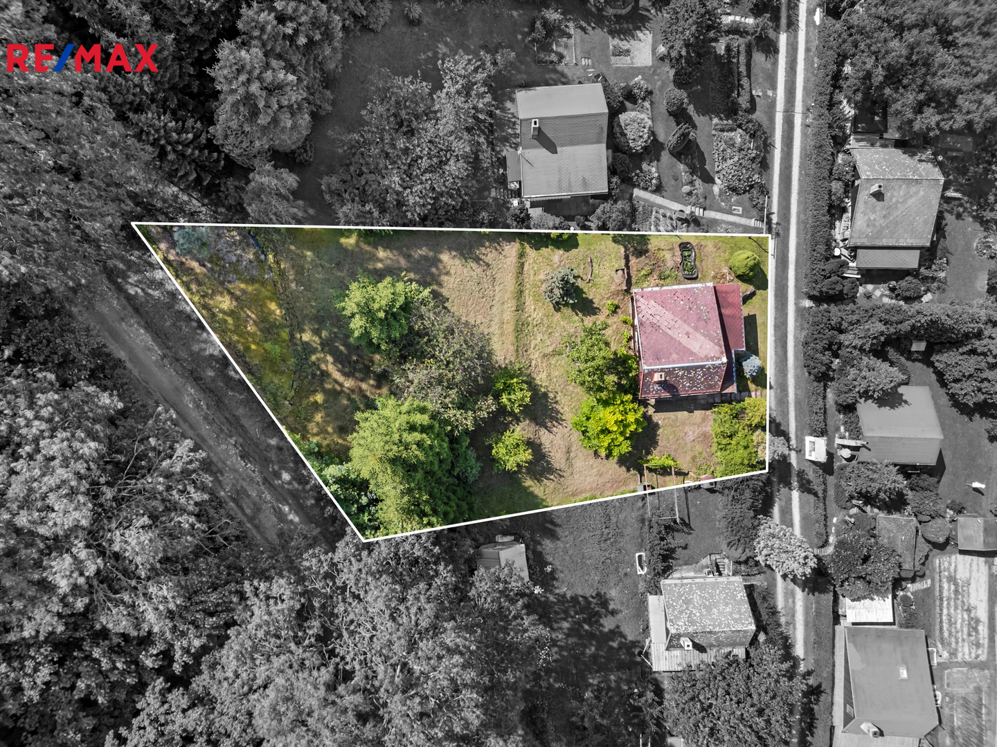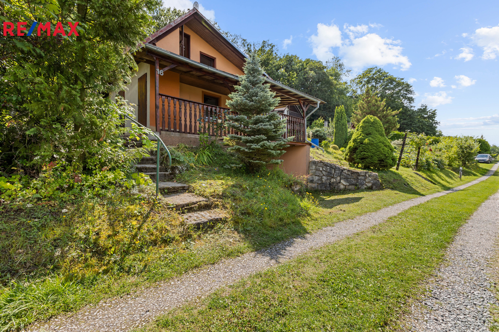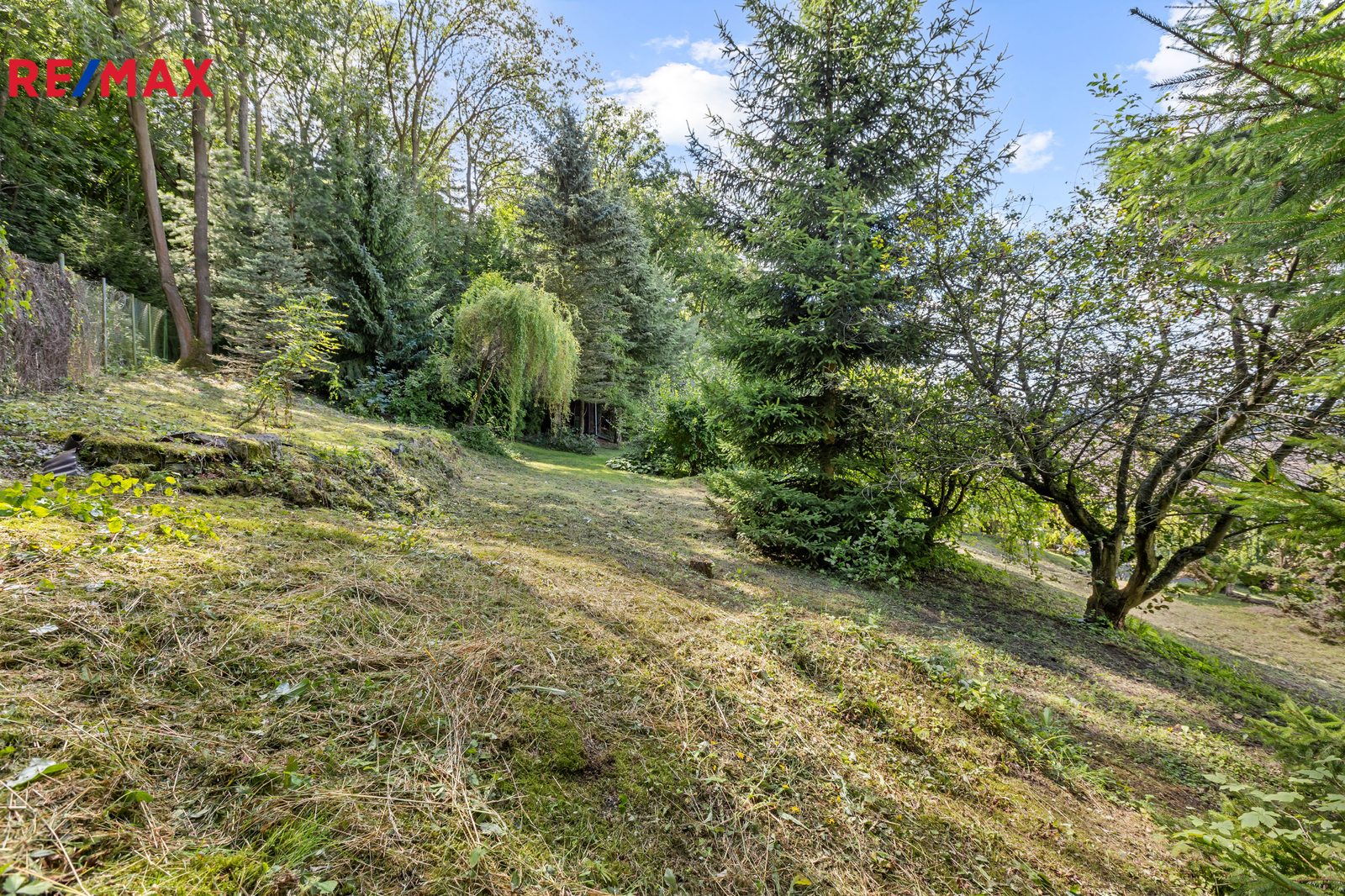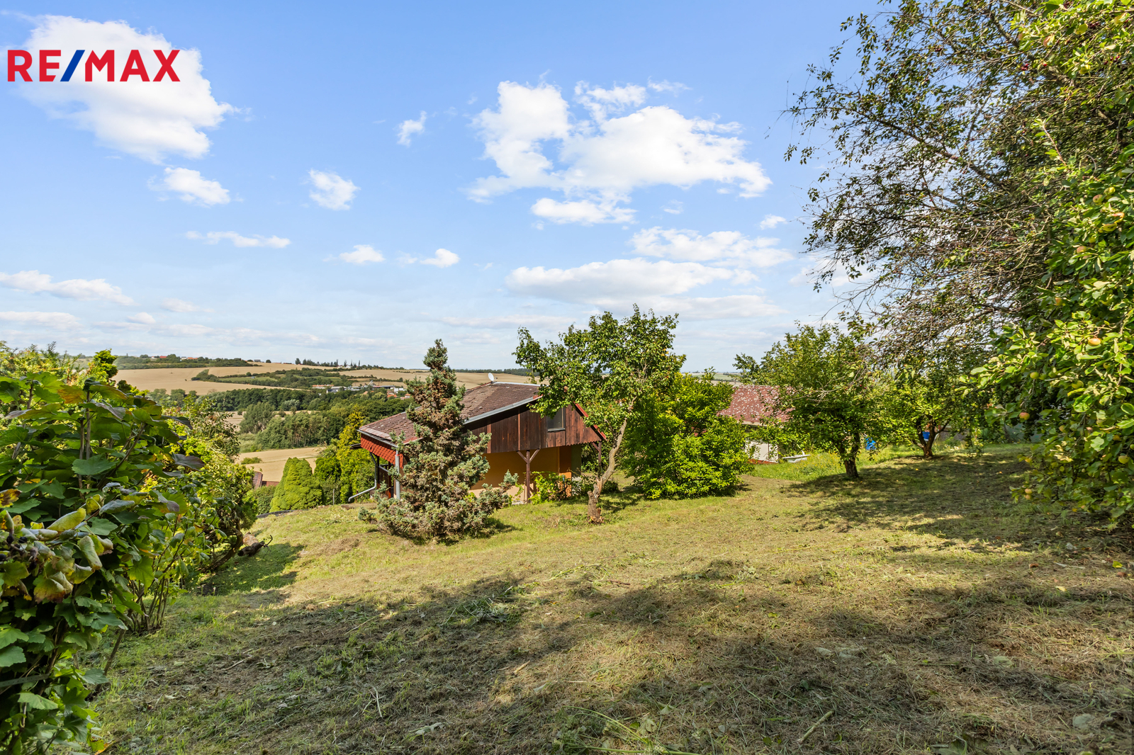 Rozlehlá a svažitá zahrada o ploše 672 m² má okrasný i užitkový charakter, nabízí několik ovocných stromů, venkovní posezení, možnost vybudování skalky a parkovací stání. Parkování je možné přímo u sklepů chaty, případně lze využít i vlastní příjezdovou cestu nad chatou.