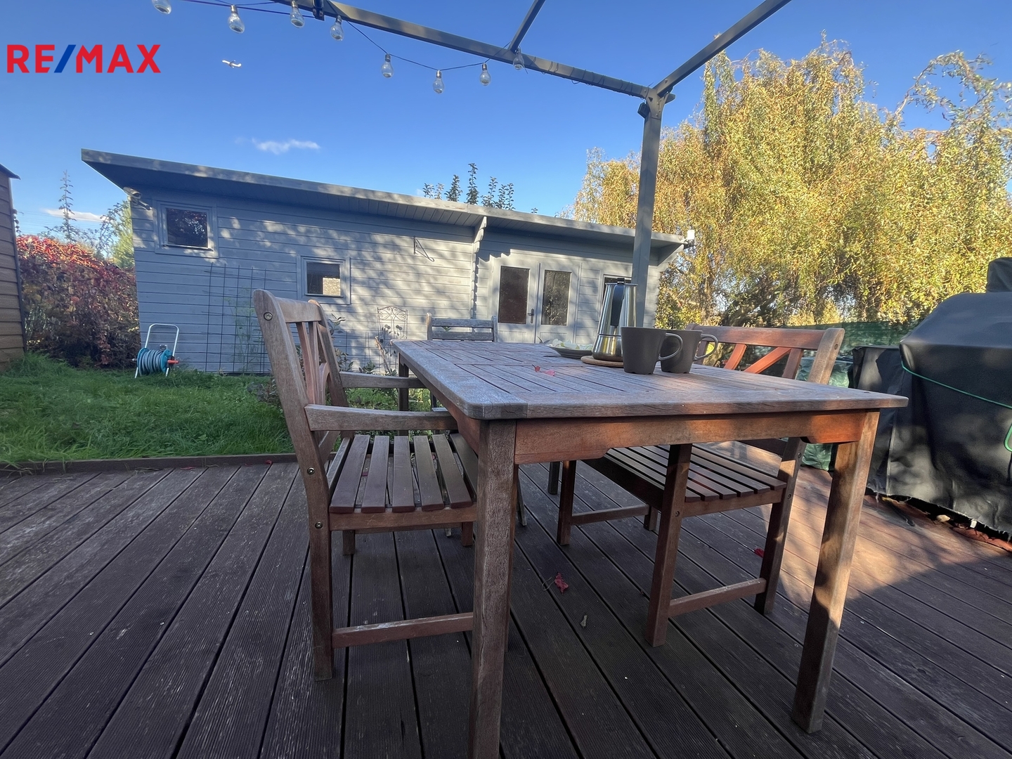 K příjemnému posezení láká venkovní terasa s pergolou, stolem a grilem.