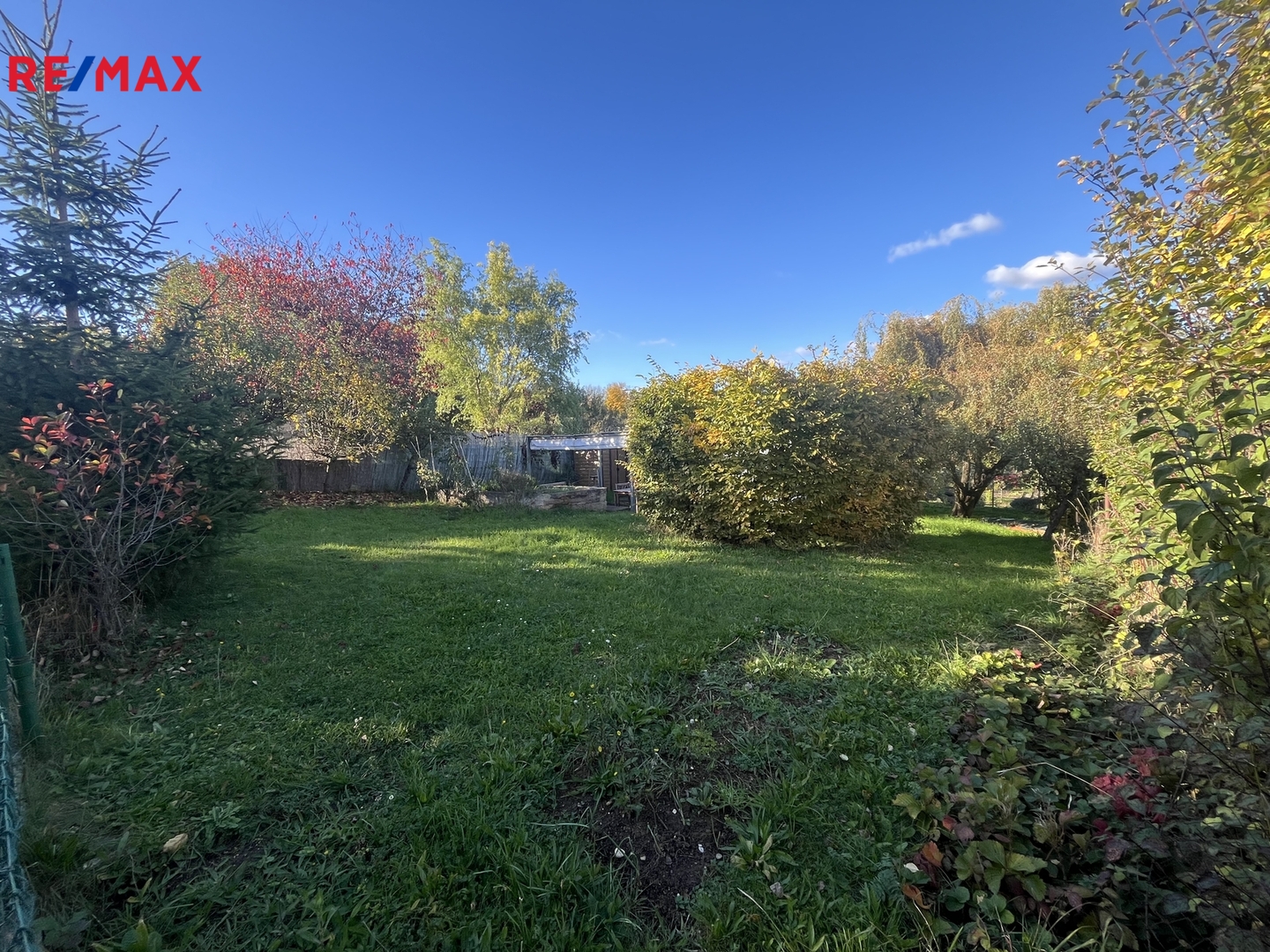 Na zahradě jsou vzrostlé jabloně, rybízy, kanadské borůvky a bylinková zahrádka.