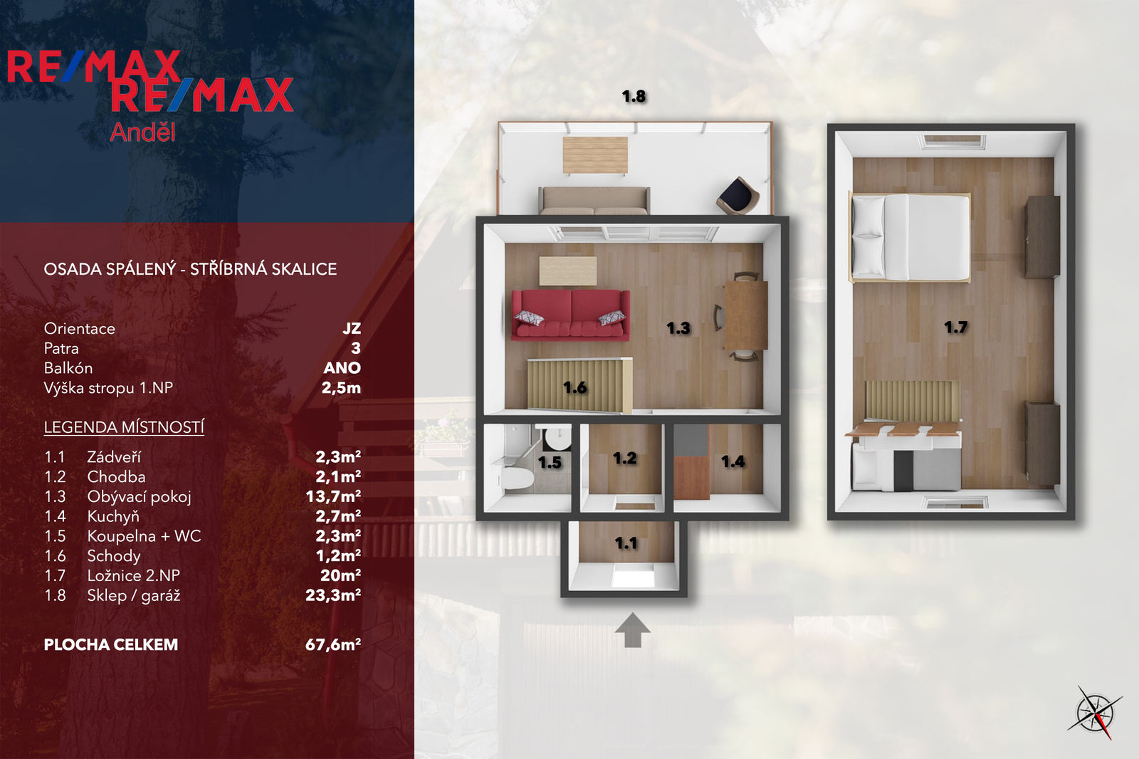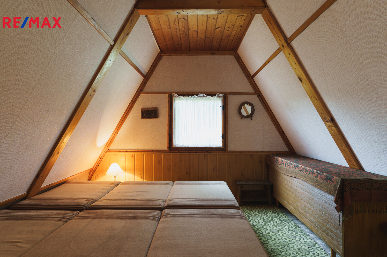 Chata má podlahovou plochu 67,6 m² a stojí na vlastním pozemku o výměře 398 m². V prvním patře najdete společný prostor s kuchyní, jídelním koutem, rozkládací pohovkou, a vstupem na prostornou terasu, kde si můžete vychutnat krásné západy slunce. Po schodech nahoru se dostanete do druhého patra s 1 ložnicí, rozdělenou na dvě části. (celkem 4 lůžka)