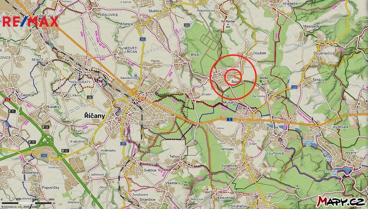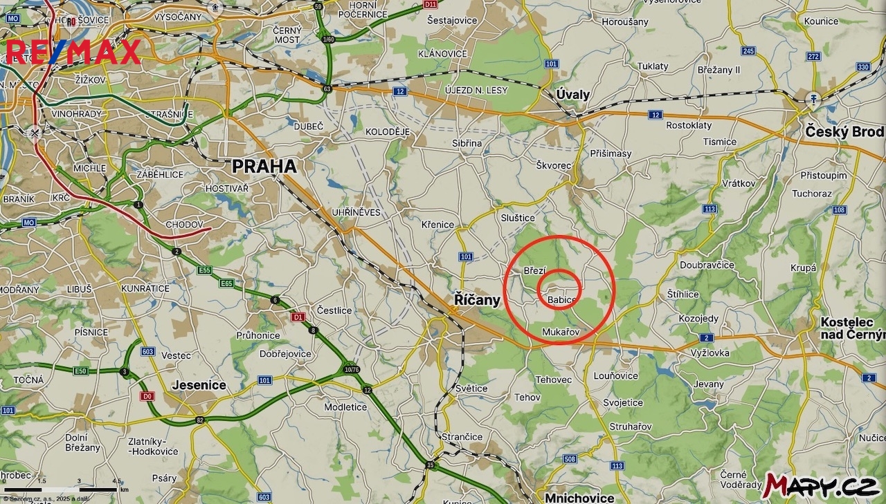 Dopravní dostupnost: Praha 21 km metro A i C, vlak Český Brod i Říčany, PID: Autobusová zastávka cca 300 m se spojem na vlakové nádraží na Prahu