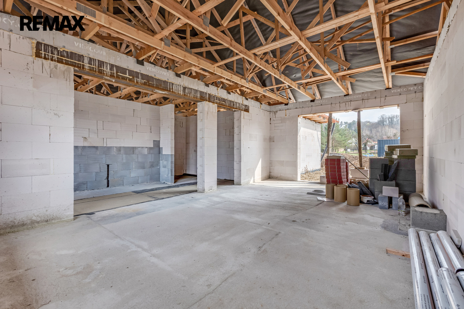 Dům se nachází ve fázi, kdy je již dokončena hrubá stavba – tedy ta nejnáročnější a finančně nejnákladnější část výstavby. Objekt je nově osazen okny, vstupními dveřmi a garážovými vraty, což umožňuje okamžité pokračování prací bez zdržení. K nemovitosti je k dispozici kompletní projektová dokumentace, která vám výrazně usnadní dokončení stavby dle vlastních představ a standardů.