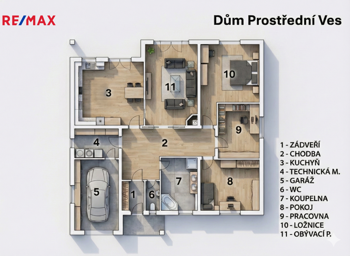 Zázemí domu tvoří moderní koupelna vybavená vanou i sprchovým koutem, samostatná toaleta a technická místnost, kde je umístěno tepelné čerpadlo. Velkou výhodou je prostorná garáž, která je součástí domu a umožňuje pohodlný "suchý" vstup přímo do obytné části, což oceníte zejména v zimních měsících.
