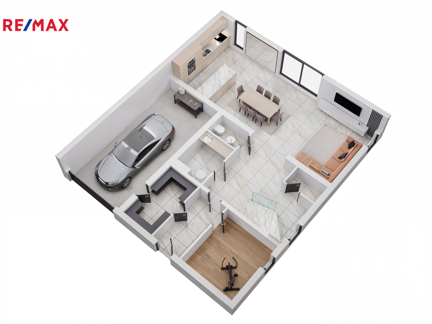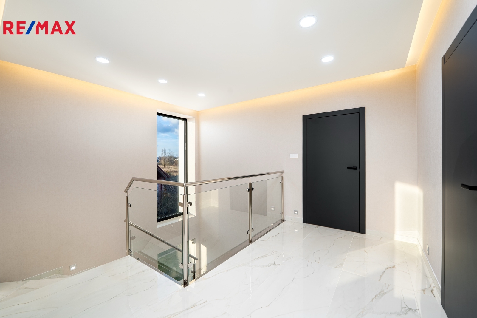 Dům je mimořádně světlý a prosluněný, s velkorysým množstvím přirozeného denního světla, které přináší do každého pokoje pocit vzdušnosti a pohody. Interiér je proveden v jemných světlých přírodních tónech, nadčasových a harmonických, které vytvářejí klidnou a příjemnou atmosféru pro každodenní život. Elegantní kontrastní černé dveře dodávají interiéru moderní nádech a zvýrazňují čistotu a světlost prostoru.