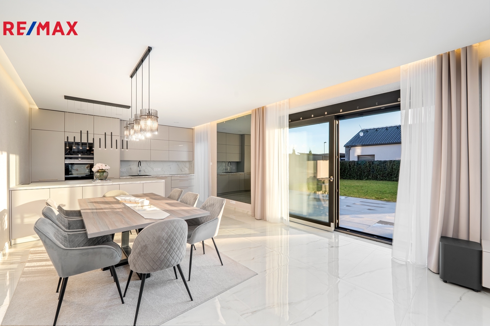 Srdcem domu je luxusní kuchyňská linka na míru, světlá, prostorná a dokonale zpracovaná, kde je radost vařit – ať už pro rodinu nebo při setkání s přáteli. Kuchyň přirozeně navazuje na obytný prostor a propojuje vaření s pohodovou atmosférou a denním světlem, které sem proudí z velkých oken.