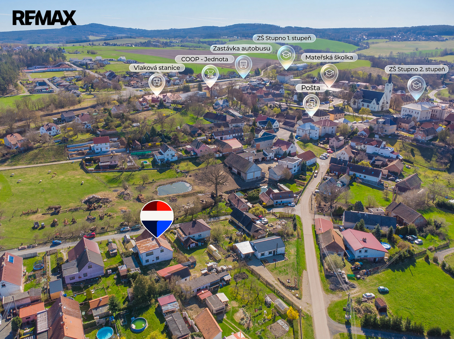 Veškerá občanská vybavenost se nachází v obci (MŠ, ZŠ, obchody, kavárna, lékaři).