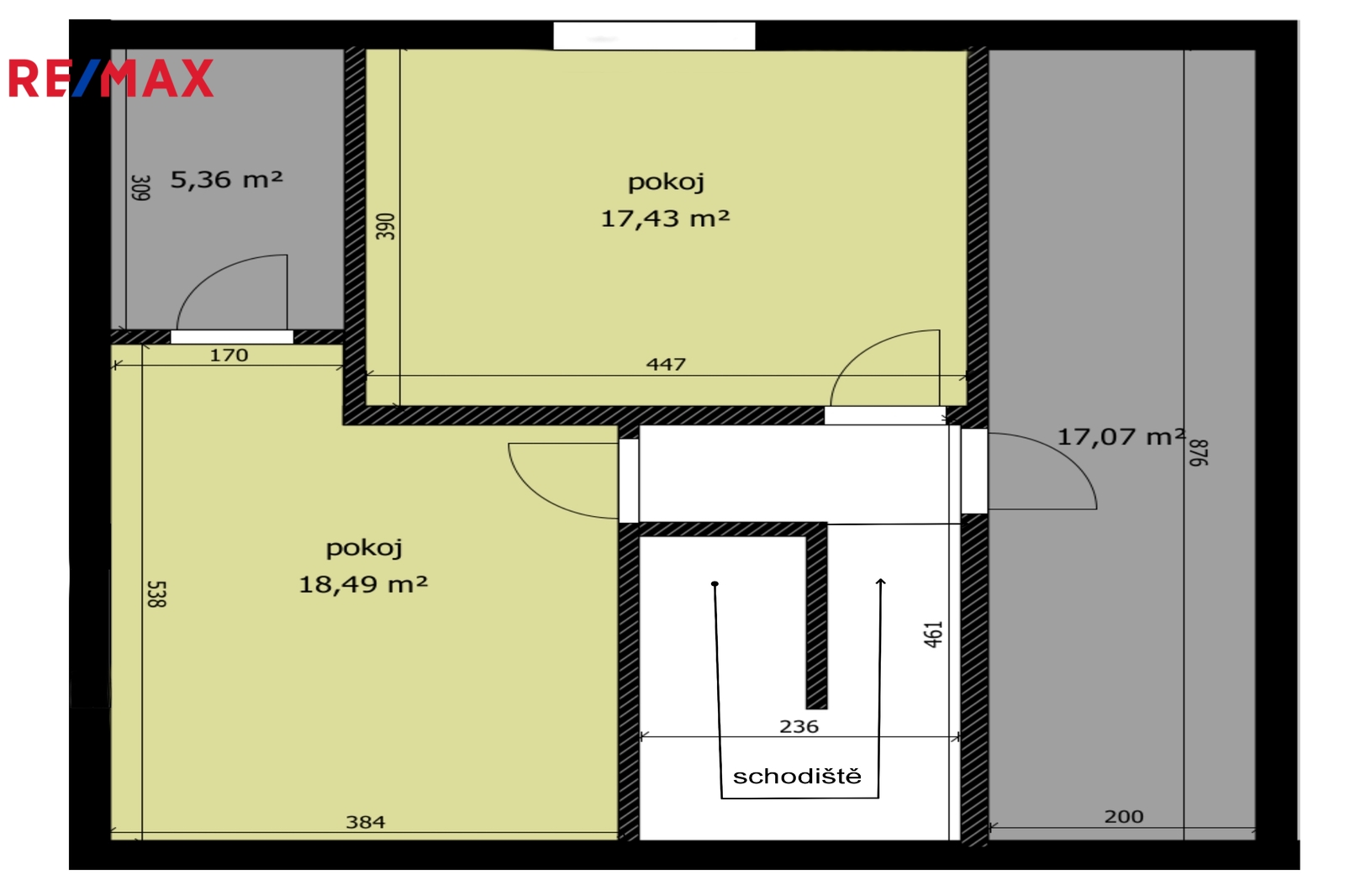 1. patro: dva pokoje, půdní prostor, který lze v rámci rekonstrukce dále využít.