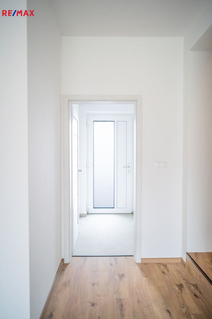 Novostavba o dispozici 3+kk nabízí téměř 100 m² užitné plochy a vlastní pozemek o velikosti přes 100 m². Dům je navržen s důrazem na funkčnost, komfort a současný moderní styl. V přízemí se nachází vstupní chodba s místem pro vestavěné skříně, samostatná toaleta a praktická komora pod schody, kterou lze využít jako spíž či úklidový prostor. Dominantou je světlý obývací pokoj s kuchyňským koutem a velkým francouzským oknem, které plynule propojuje interiér s terasou o velikosti přibližně 12 m² a navazující zahradou – ideálním místem pro letní posezení, grilování i rodinné chvíle.