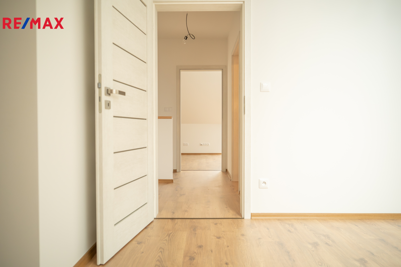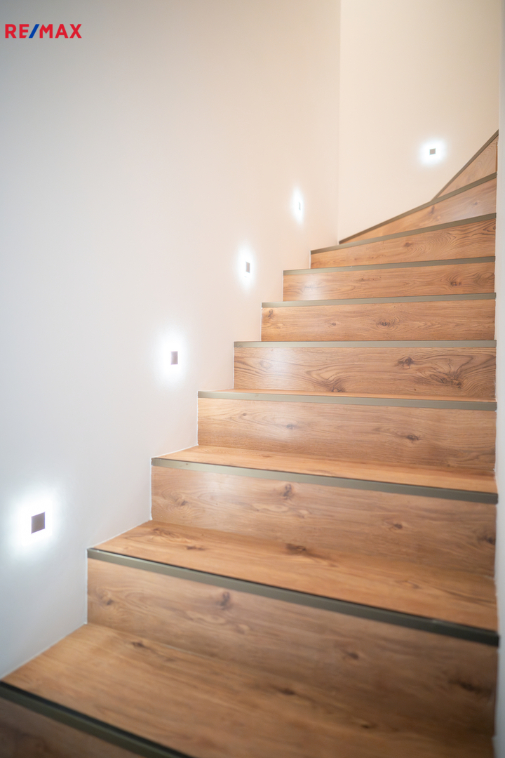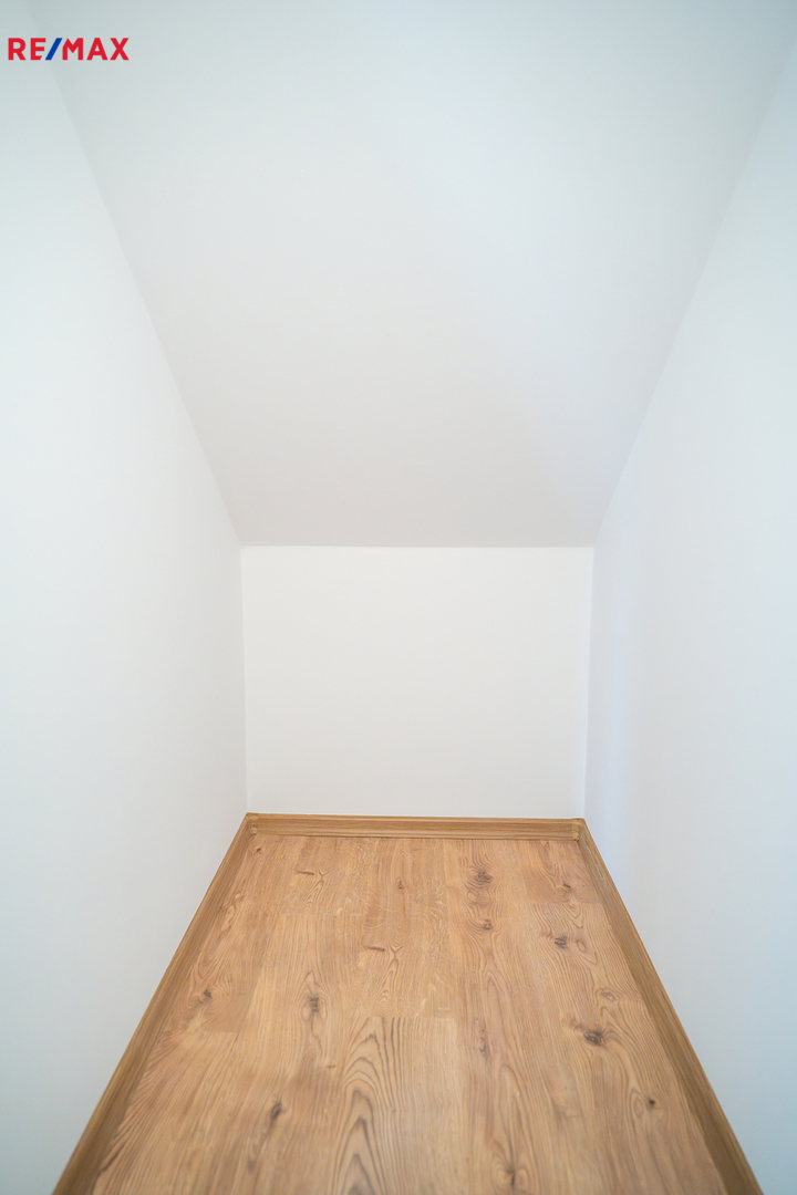 V patře se nachází dětský pokoj, prostorná ložnice a koupelna. Interiér je příjemně prosvětlen designovými střešními okny, která dodávají místnostem vzdušnost a přirozené světlo. K domu náleží dvě parkovací místa přímo před vstupem.