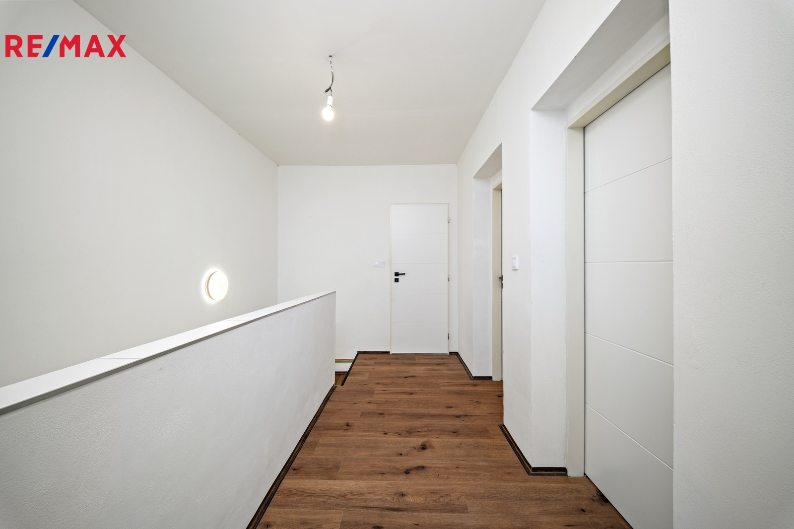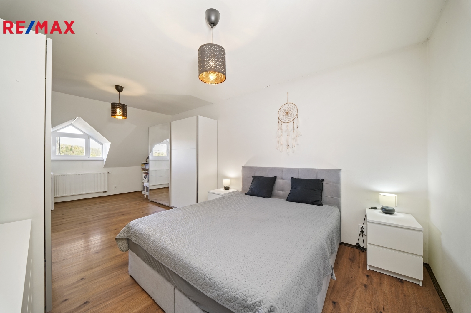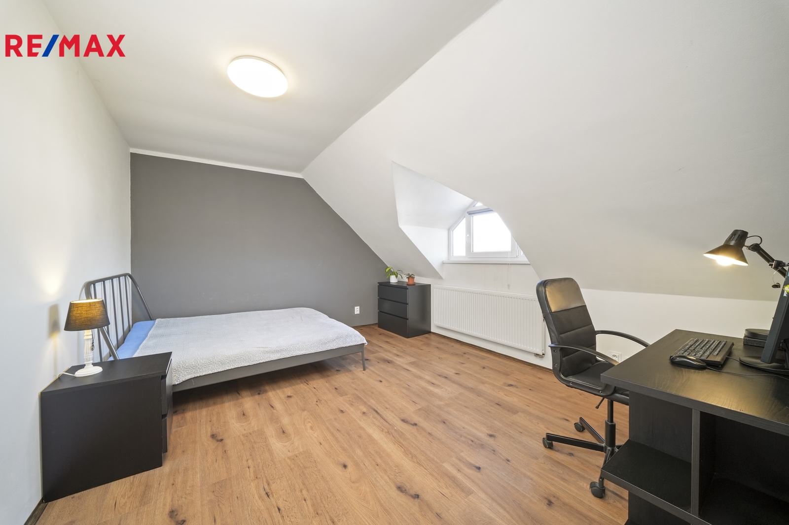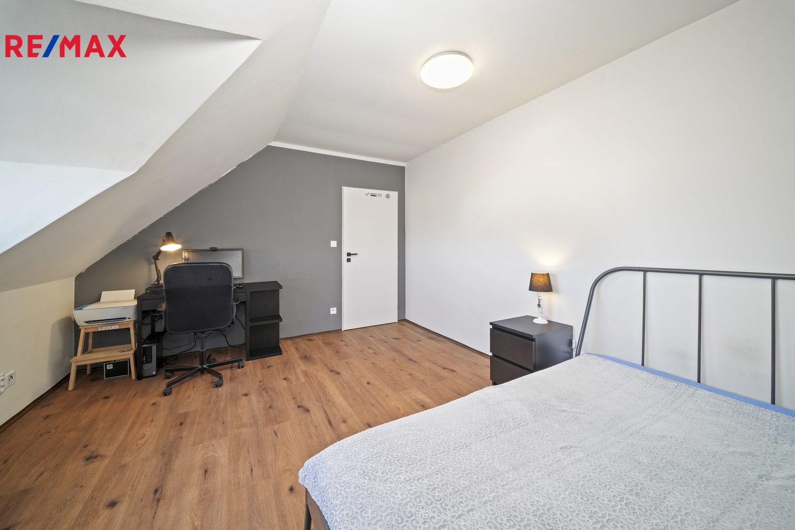 Do druhého patra vede betonové schodiště a nabízí tři samostatné pokoje. Aktuálně jsou využívány jako dětský pokoj, pracovna a ložnice.