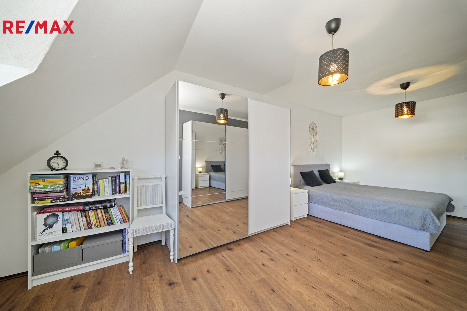 Dětský pokoj a ložnice umožňují východ na terasu směřujícího do klidu dvora. Pracovna a ložnice nabízí nádherný pohled do okolních kopců, na zámek a kapličku v Dolních Kounicích -> tento pohled se neomrzí.