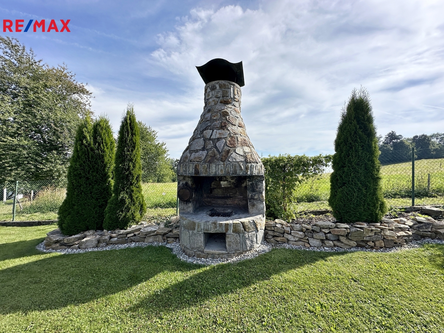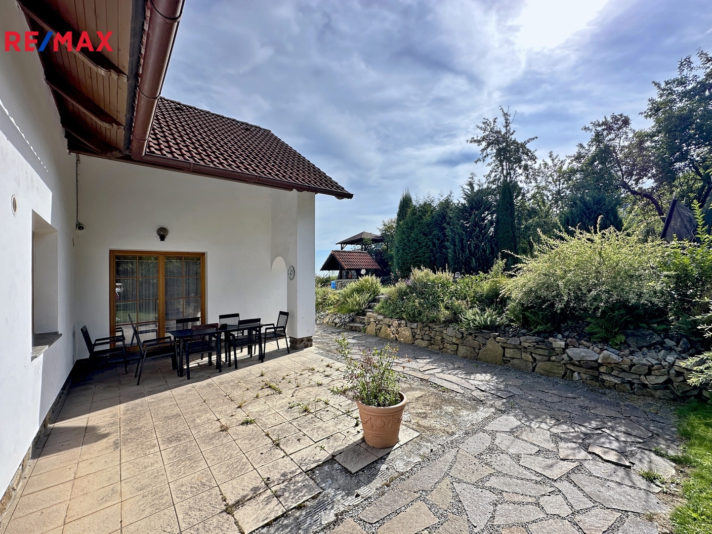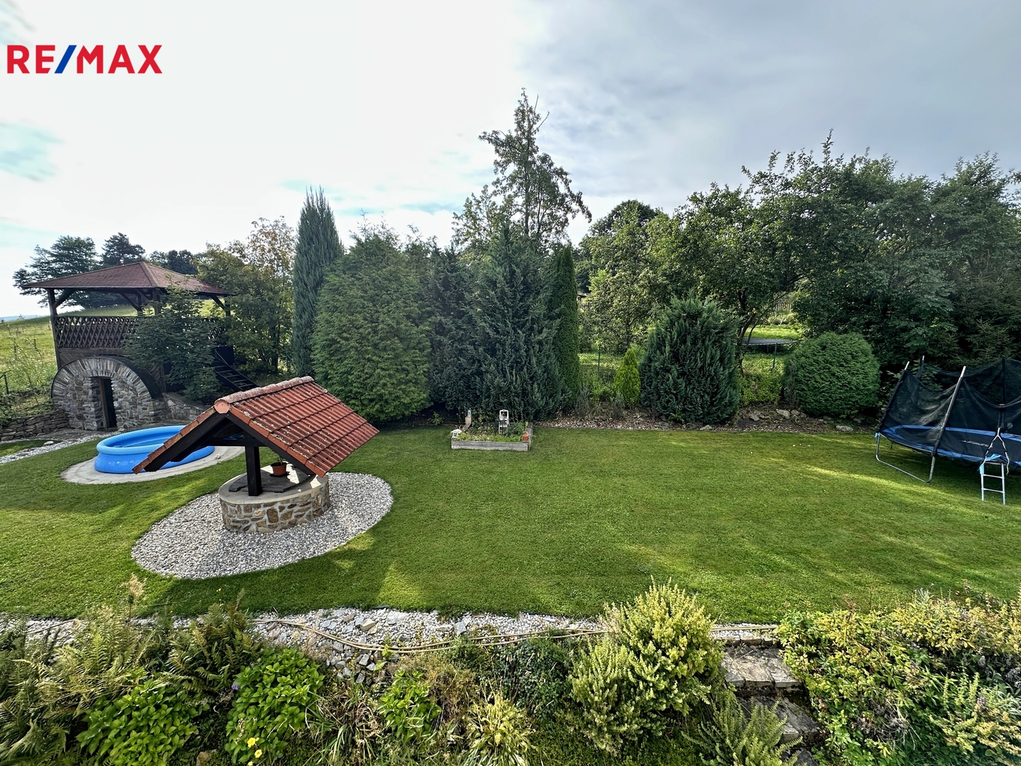 Udržovaná zahrada je osázena okrasnými dřevinami a nabízí dostatek prostoru pro bazén a nabízí netradiční vyvýšené terasové posezení s výhledem do přírody. Ideální místo pro relaxaci s rodinou či přáteli. Součástí zahrady je také kamenný sklípek, který může sloužit například jako vinný.