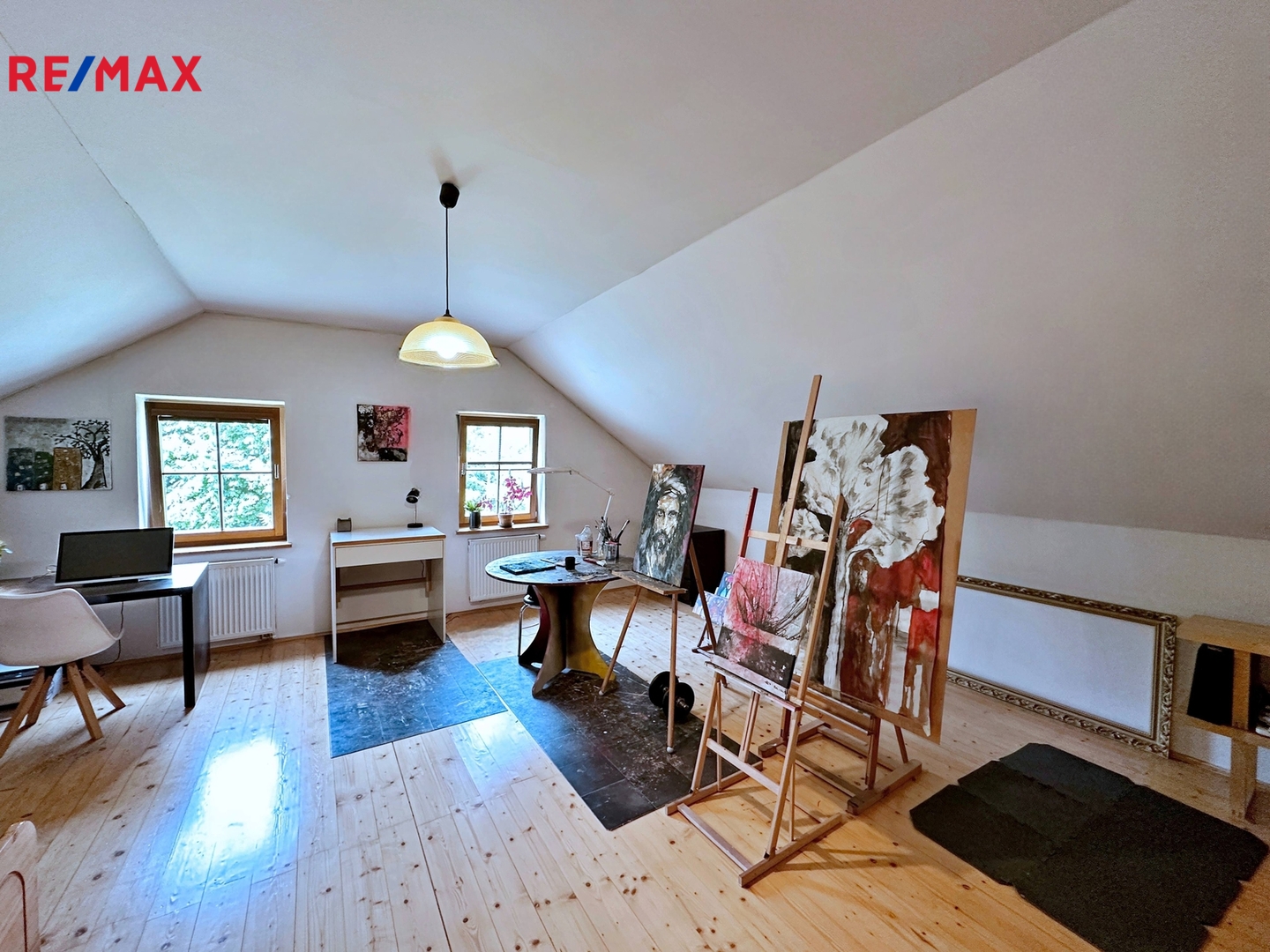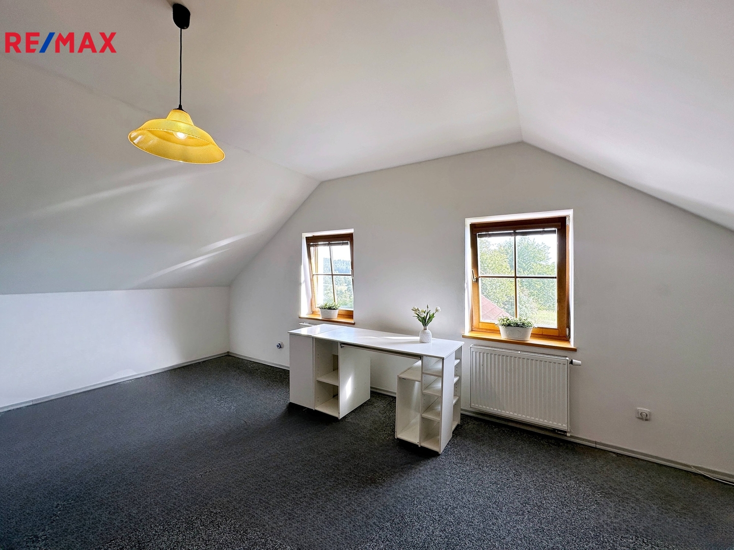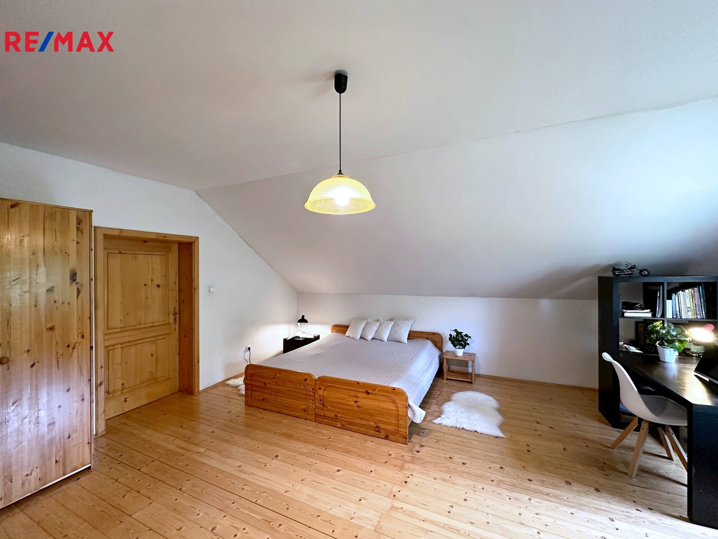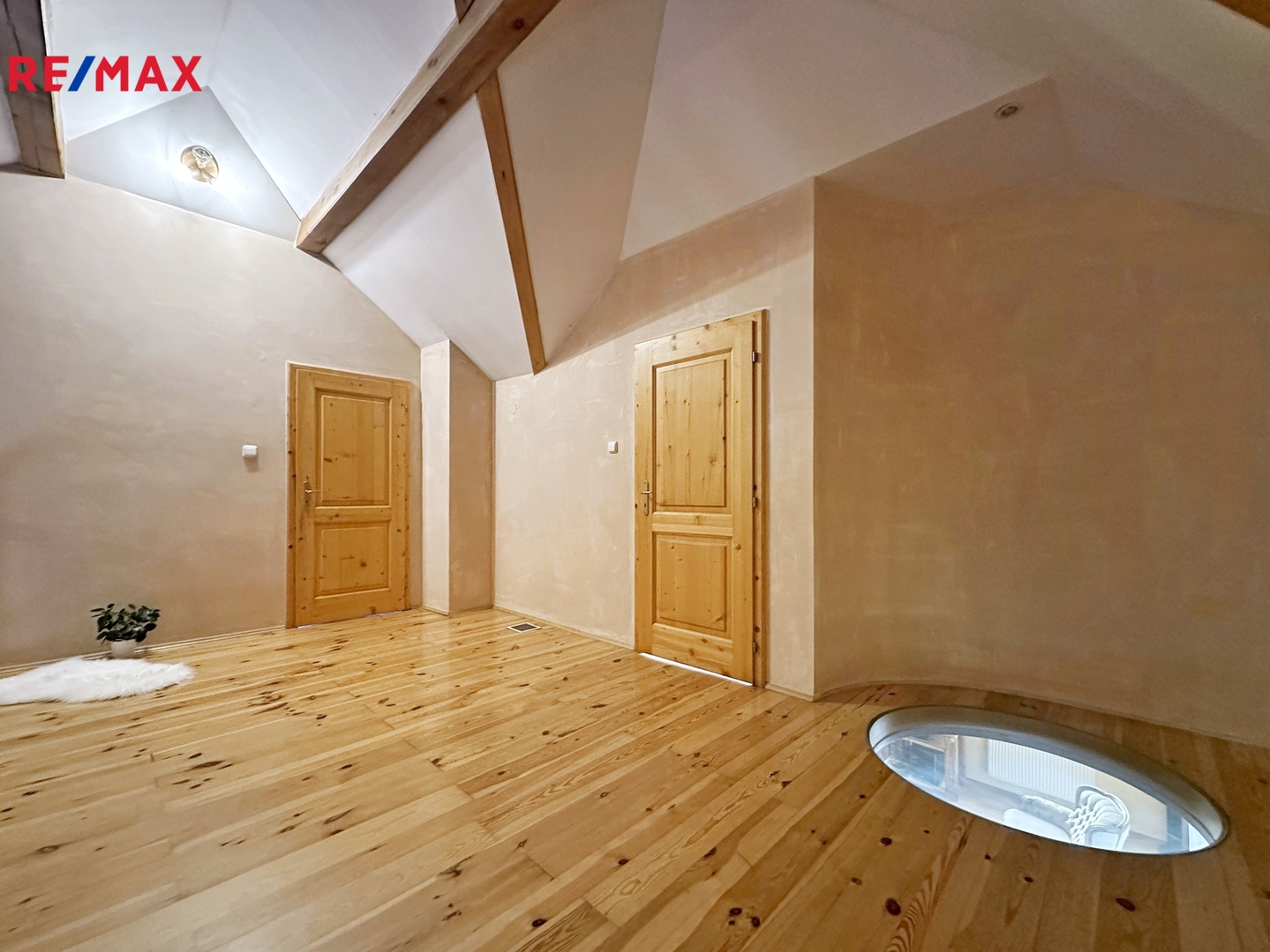 V patře vás zaujme hala s designovým prvkem – prosklenou podlahou, která propouští světlo a dodává interiéru umělecký akcent. Najdete zde tři světlé, neprůchozí ložnice, francouzské okno s výhledem na šumavské kopce a koupelnu se sprchovým koutem a WC.