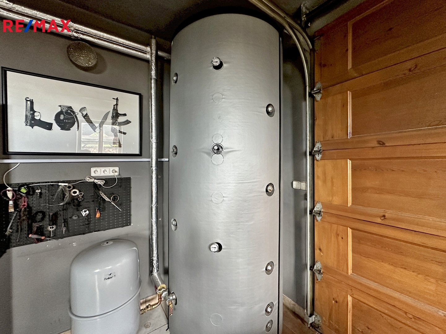 Vytápění: ústřední – kombinace radiátorů a podlahového topení (v určitých částech domu) v kombinaci s krbem, který vytopí další pokoje v domě a další alternativou je kotel na tuhá paliva