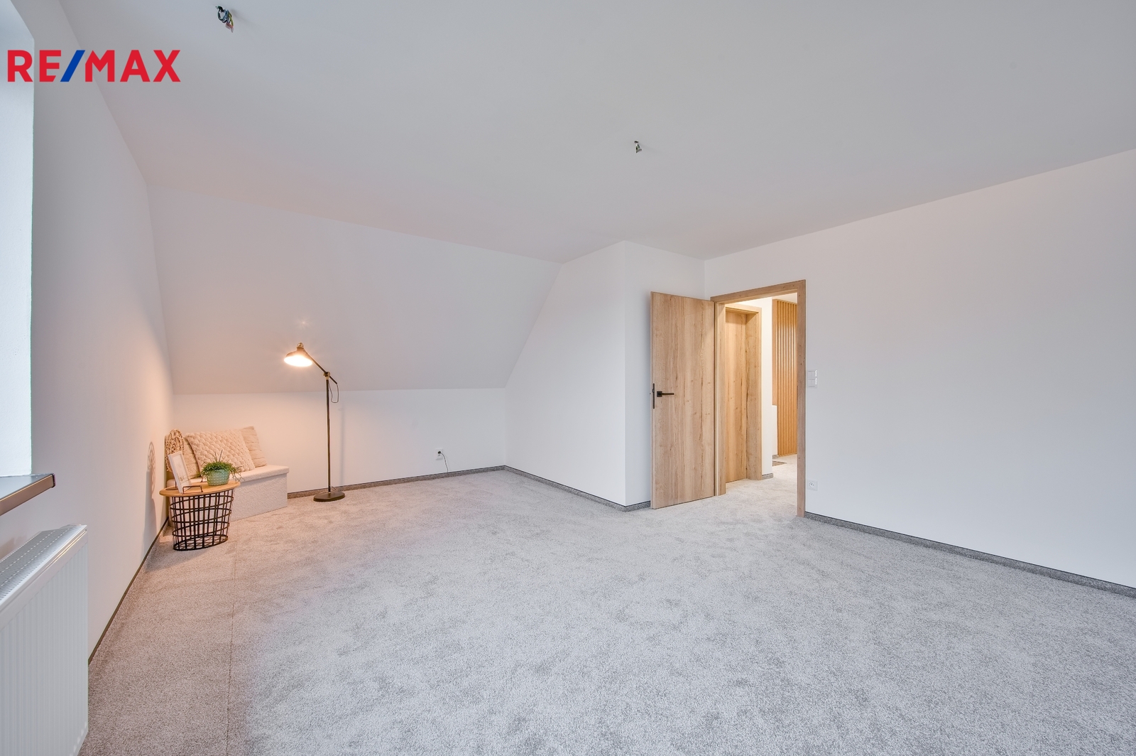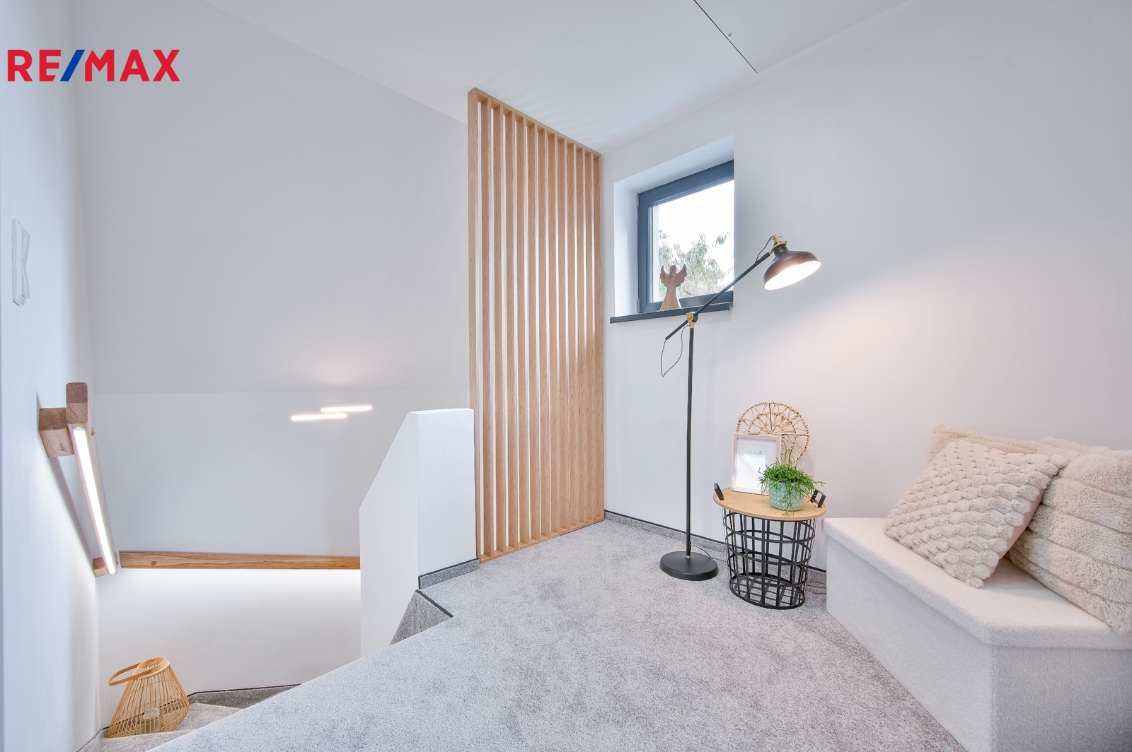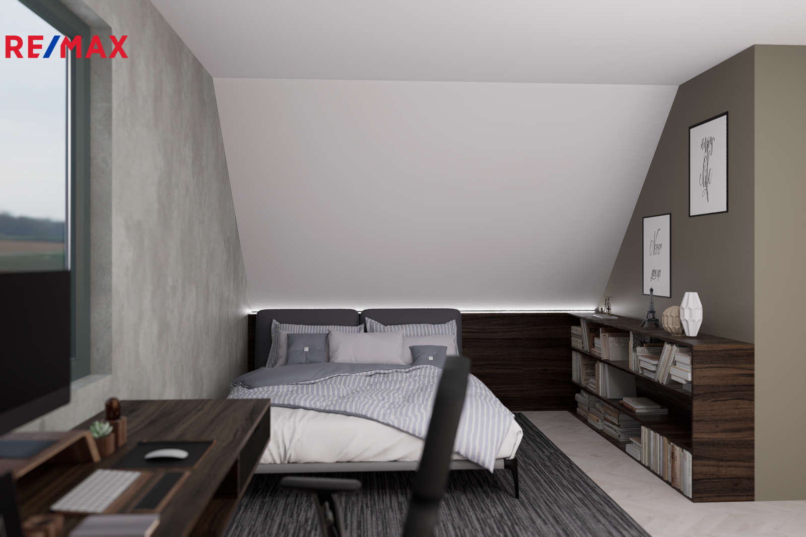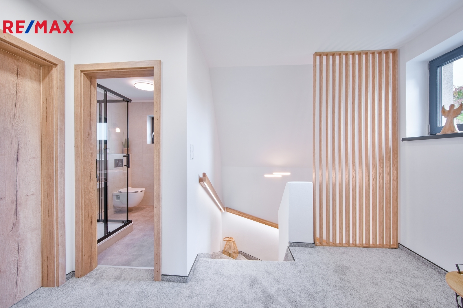 V patře domu jsou umístěny dvě velké ložnice, každá s vlastní šatnou, a další moderní koupelna, tentokrát vybavená sprchovým koutem. Prostor u schodiště je ideální pro vytvoření útulného čtecího koutu nebo domácí kanceláře.