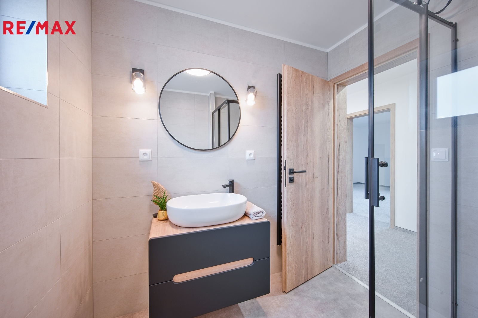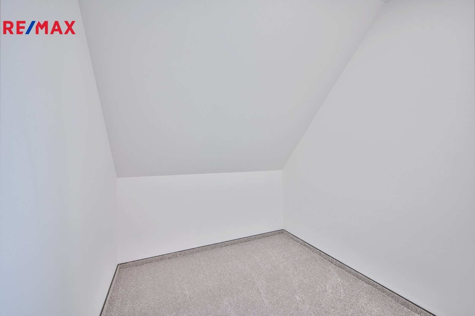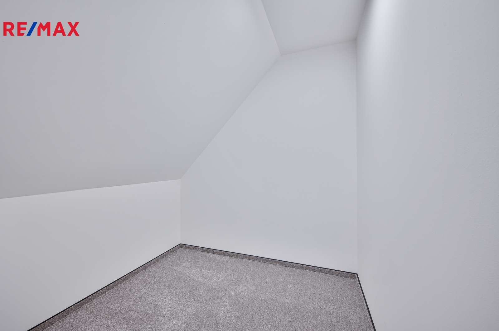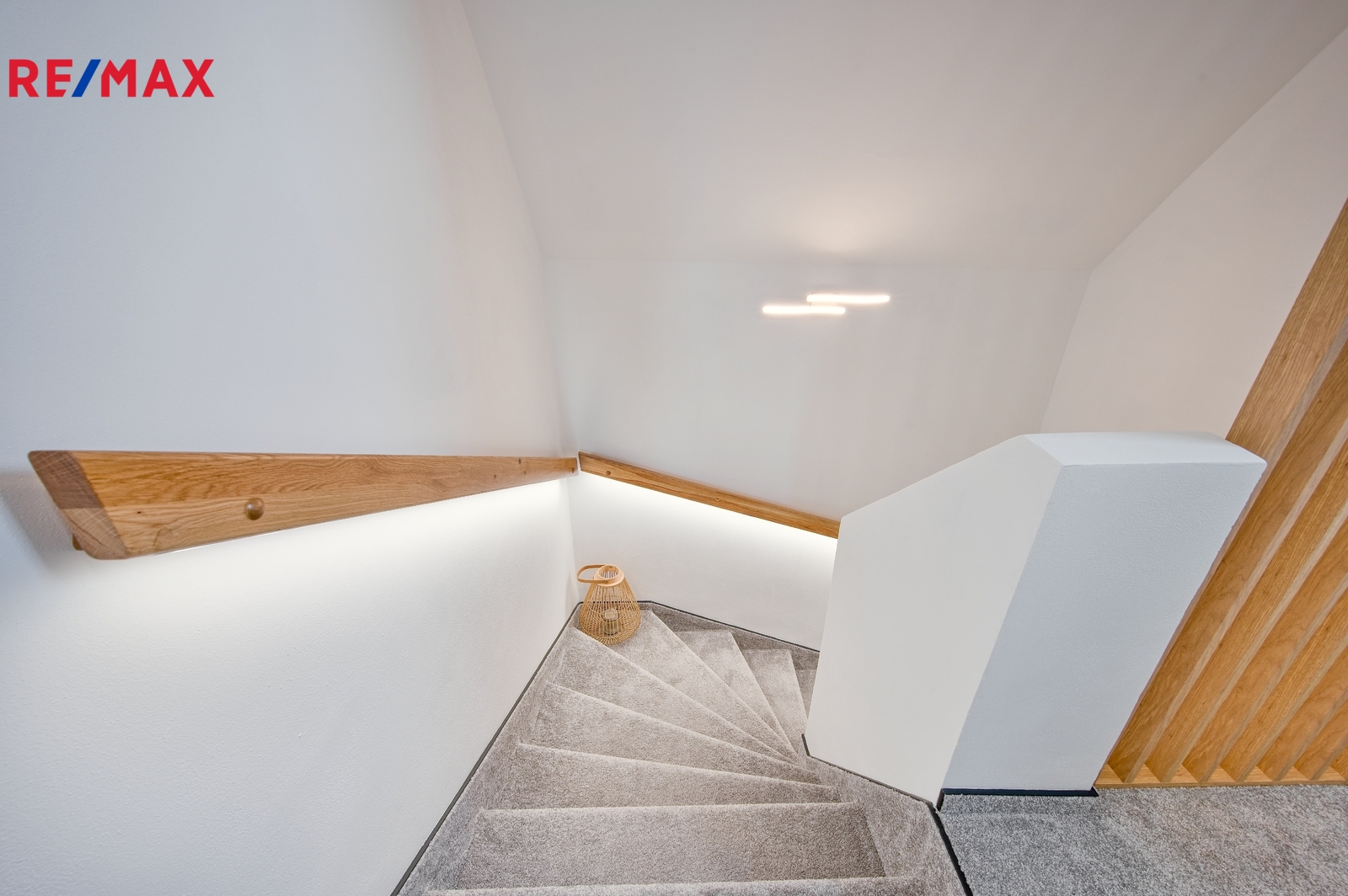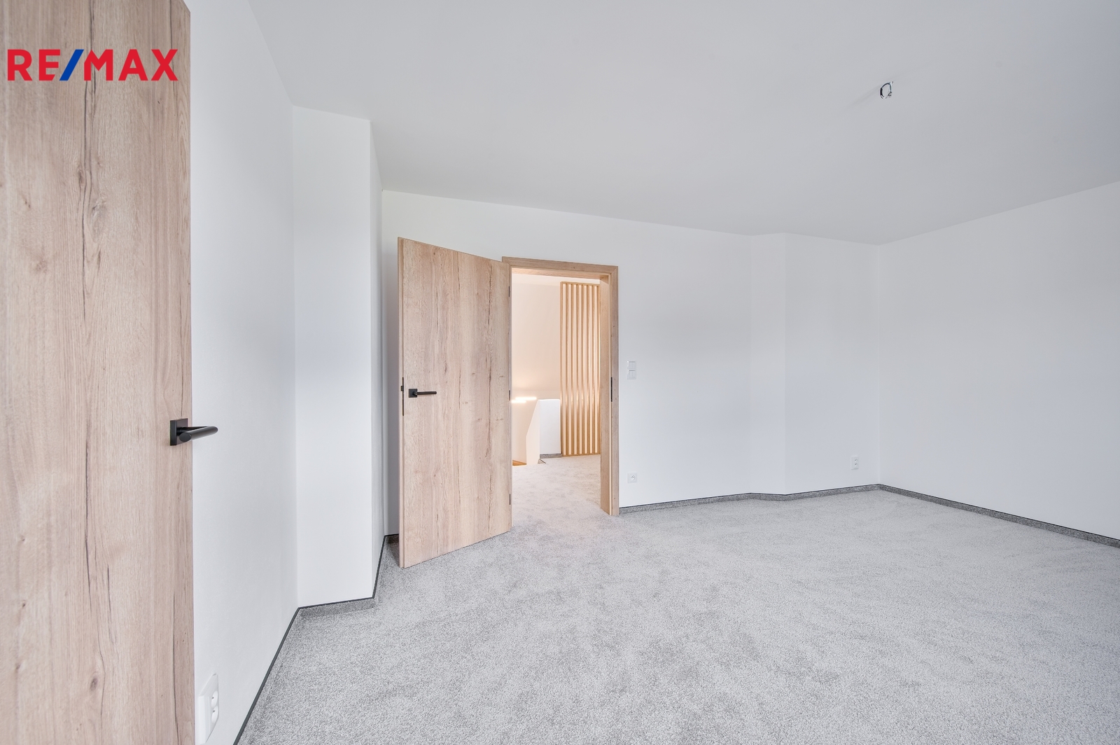 V patře domu jsou umístěny dvě velké ložnice, každá s vlastní šatnou, a další moderní koupelna, tentokrát vybavená sprchovým koutem. Prostor u schodiště je ideální pro vytvoření útulného čtecího koutu nebo domácí kanceláře.