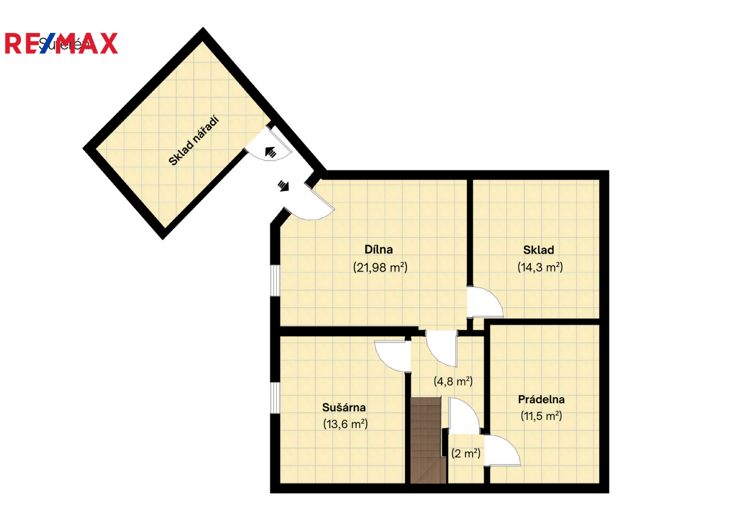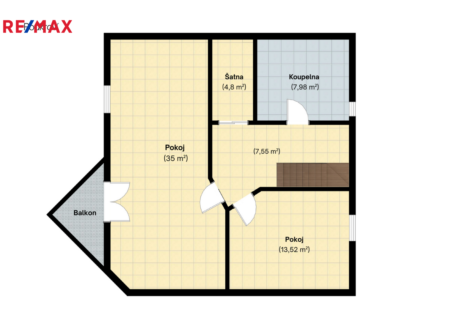 V patře je velký pokoj s balkonem (možno rozdělit na dva samostatné pokoje), pracovna, šatna a koupelna s vanou i sprchovým koutem. V suterénu je technické zázemí – prádelna, spíž, domácí práce, sklad a dílna.